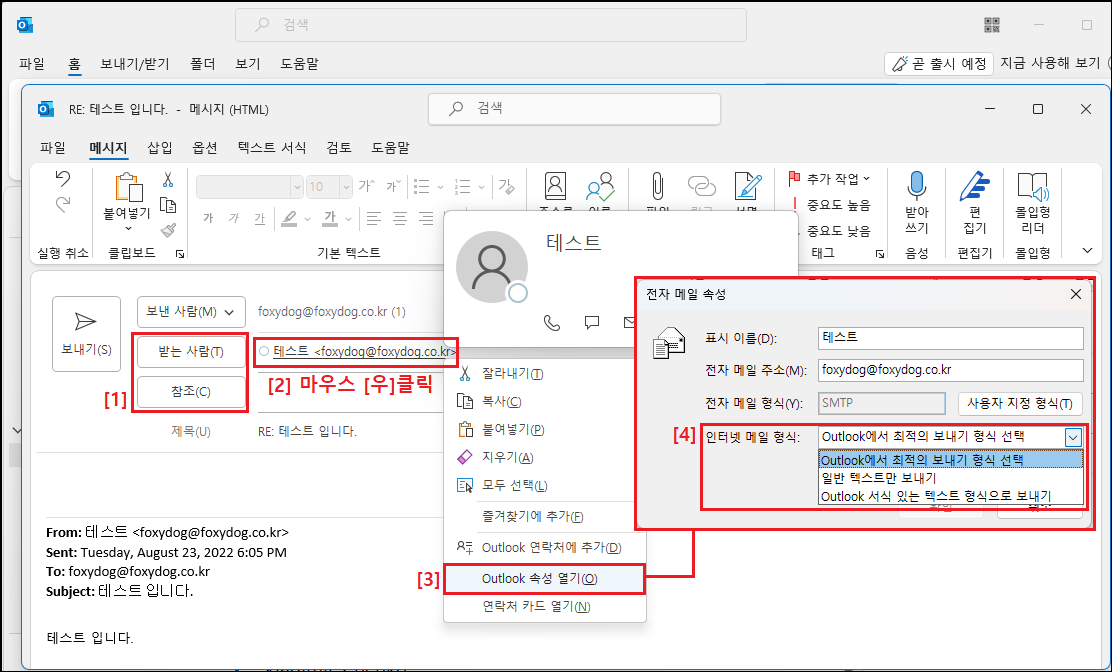 이렇게 할 수도 있지만, 받는 사람을 입력 시 자동 완성된 메일 주소로 발송하지 말고 삭제 후에 수신자의 메일 주소를 직접 입력하여 발송합니다. 이 행위를 2~3번 이상 반복합니다. 기존 저장된 정보를 삭제하고 새로 작성하여 전자 메일 속성 기본 설정으로 인식하게 하기 위해서입니다.