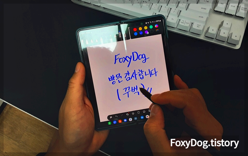 노트 20 울트라 사용할 때에도 S펜은 잘 사용하지 않았는데 폴더 화면이 크니까 S펜 사용하는 맛이 납니다. 또한 이것도 개선이 많이 되었는지 반응속도가 아주 좋습니다. 실제 종이에 쓰는 것과 비슷한 느낌을 받았습니다. 일부로 힌지 부분에 글을 써봤는데 약간의 울리는 느낌이 났지만 일반 사용자는 그렇게 신경 쓸 정도는 아닙니다. 웹툰이나 일러스트레이터 전문적으로 사용하시는 분들이 조금 예민하게 느껴질 수 있겠네요.