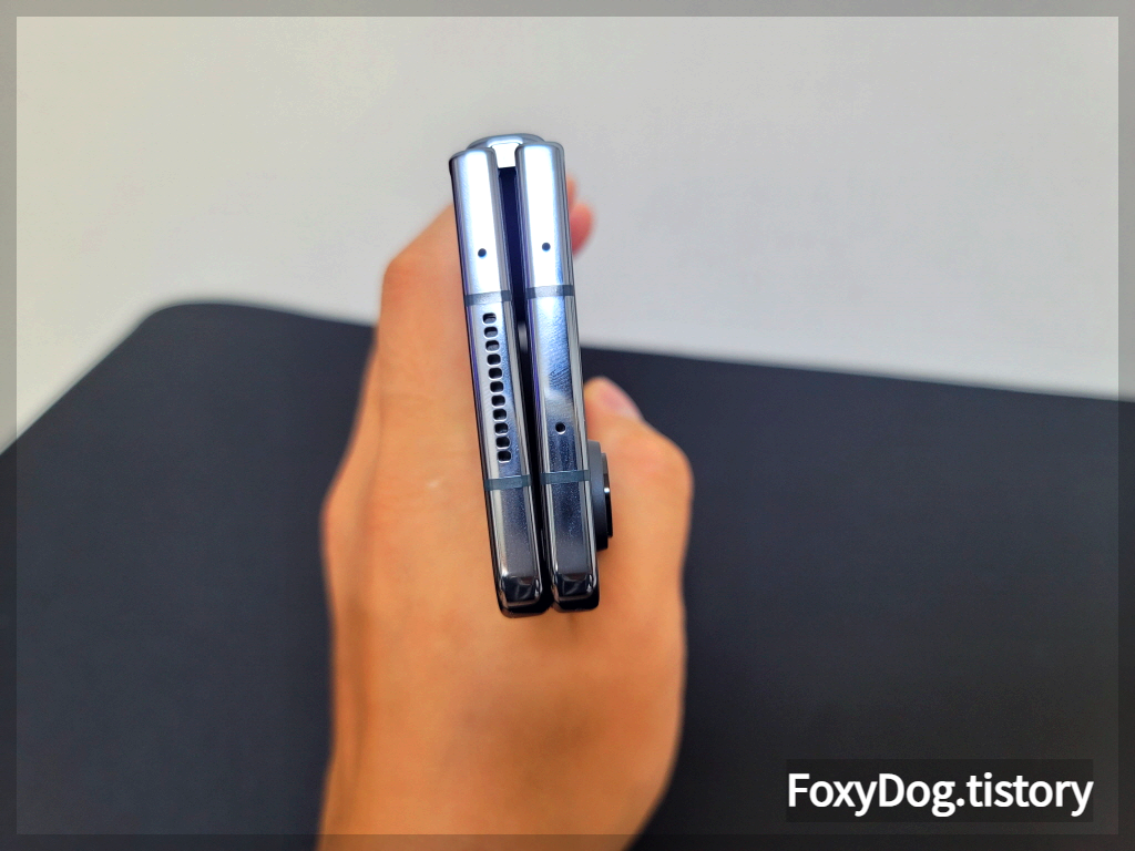 측면에는 유심 단자와 상하 버튼, 그리고 전원 버튼(지문 인식)이 같이 있습니다. 지문 인식의 경우는 노트 20 울트라에서 메인 디스플레이 지문 인식 사용에 익숙하다 보니 측면에 지문 인식은 불편하고 어색하게 느껴졌습니다. 그 외에는 특별한 불편함을 느끼지는 못했습니다. 물론 사용기간이 일주일밖에 안 되었으니 최소 1년 정도는 사용해봐야겠지요?