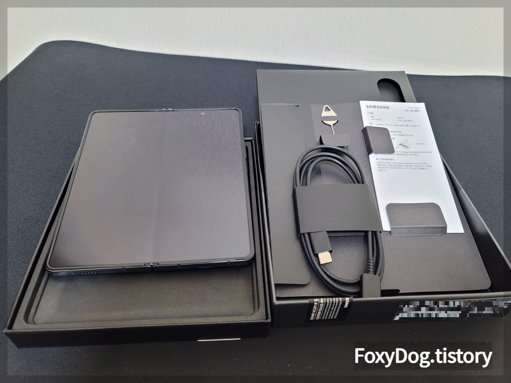 박스를 오픈하면 Galaxy Z Fold 4 기기, USB Type-C to C 커넥터, 유심 분리 핀, 간단 설명서 간단하게 구성이 되어 있습니다. 기존에 갤럭시 제품을 사용해왔다면 충전기가 필요 없겠지만 처음 구입을 하신다면 25 W PD 충전기를 별도(판매가 25,000원)로 구입을 해야 합니다.