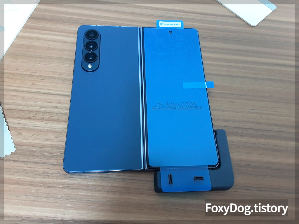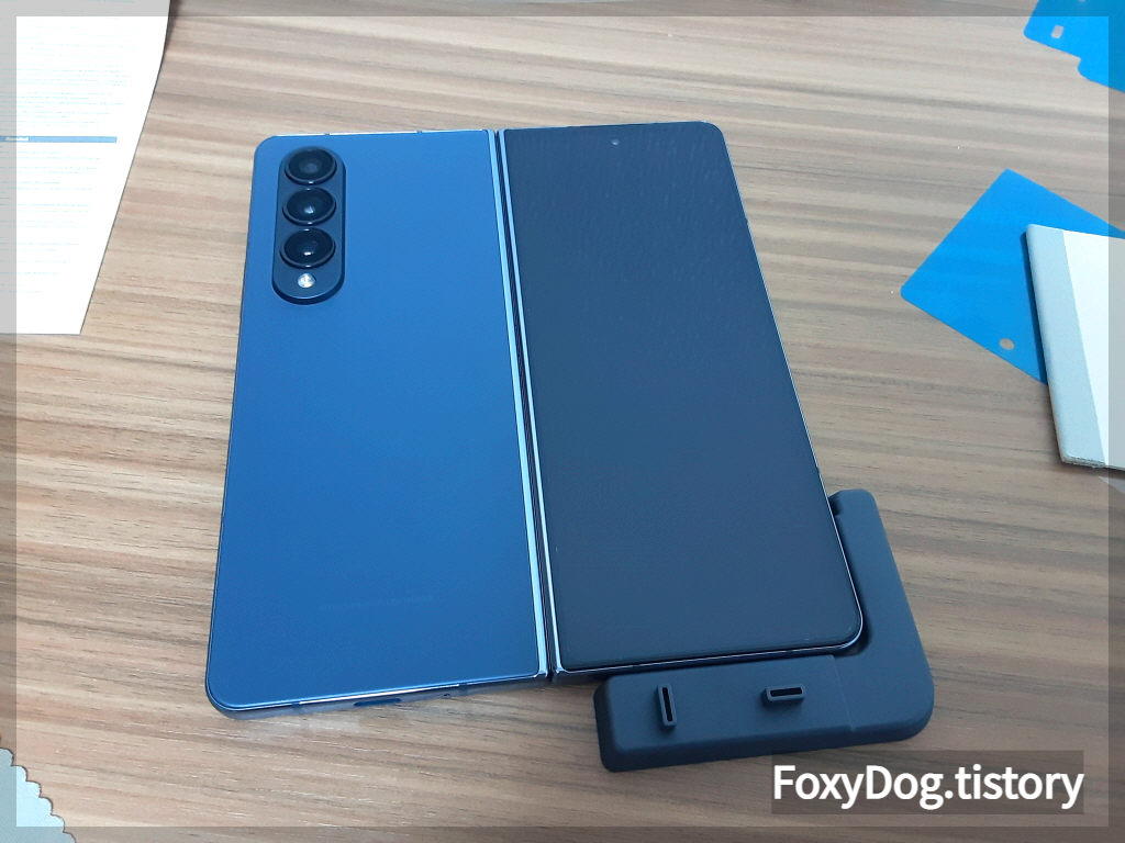 커버 디스플레이 스크린 프로텍터는 두 장이 들어 있으며 깔끔하게 붙이기 위한 보조 도구도 있어서 편하게 작업이 가능합니다. 필자는 처음에는 이물질이 많이 들어가서 두 장째에 심혈을 기울여 기포 하나 없이 깔끔하게 부착하였습니다. 요령이라고 한다면 중간 스티커를 제거하고 상단을 먼저 붙이고 하단으로 천천히 붙이시면 됩니다. 그리고 기포 제거기로 열심히 문지르면 됩니다. 드라이기로 약간의 열기를 주면서 문지르면 좀 더 효과적입니다. (힐링 실드에서 이렇게 많이 하더라고요.)