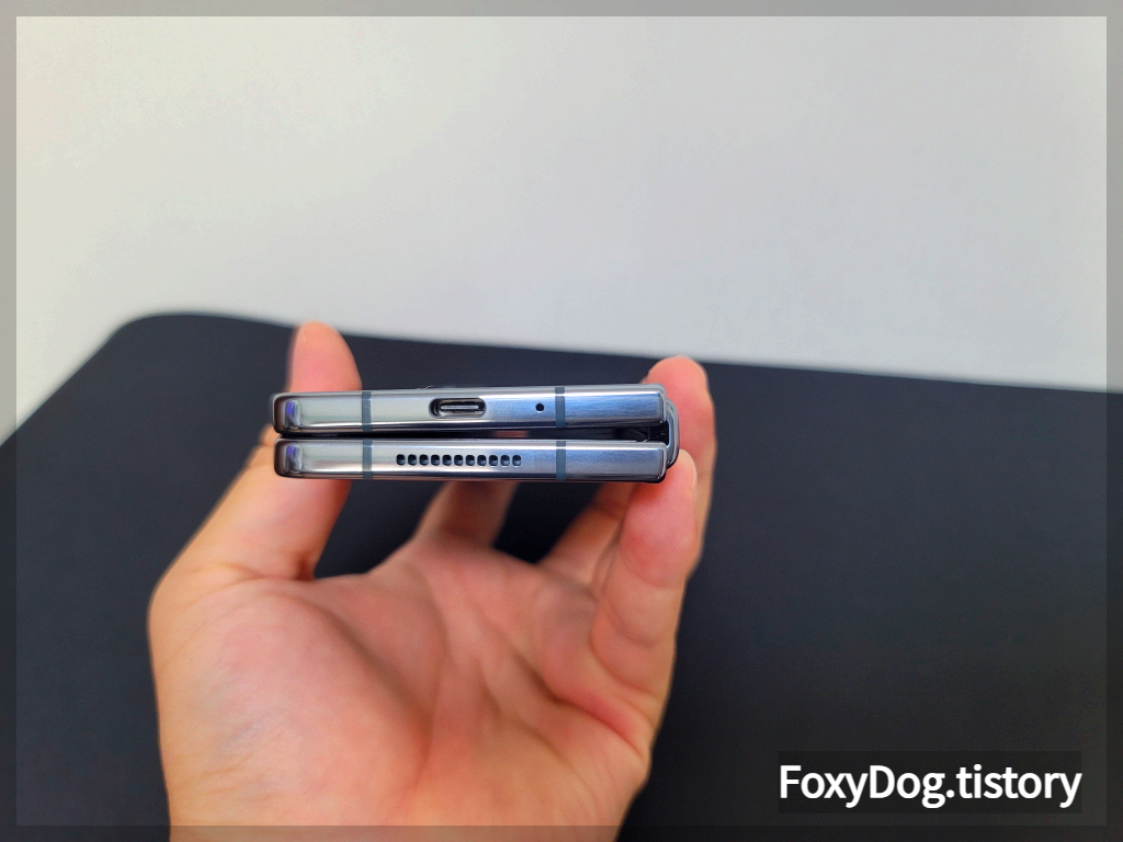 위에서부터 순서대로 힌지면, 하단, 측면, 상단의 모습입니다. 삼성 기술의 집약체 힌지 부분은 아직까지는 견고한 느낌을 받습니다. 한 손으로는 열지 못하고 두 손으로 잡고 열어야 합니다.