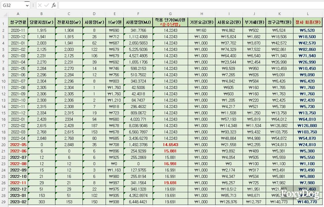 | 청구연월 | 사용량(㎥) | 1(㎥)/원 | 사용열량(MJ) | 적용 단가(MJ)/원 | 절사 최종 청구 금액(원) |