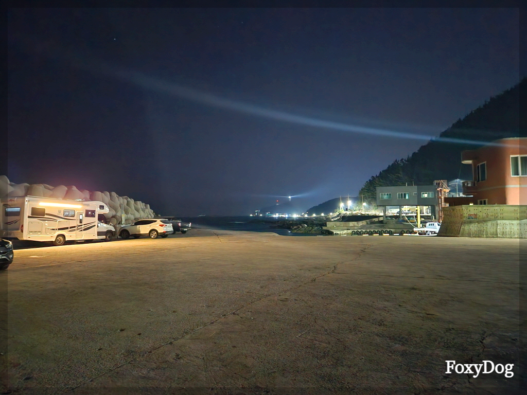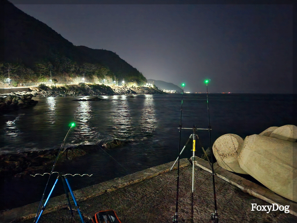 여기서 노지 캠핑을 하면서 거의 유일하게 테트라포트가 아닌 편하게 포인트를 노릴 수 있는 장소이다. 내부 정리를 마무리하는 동안 미리 낚싯대를 던져놓았다. 당시 자정이 다 된 시간이었던 것 같은데 해안 도로가 이렇게 밝았나 싶었는데 이걸 또 사진으로 담으니까 절경이다.
