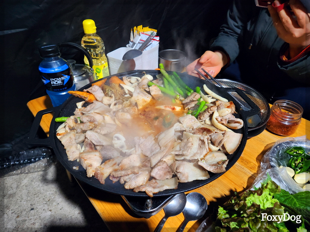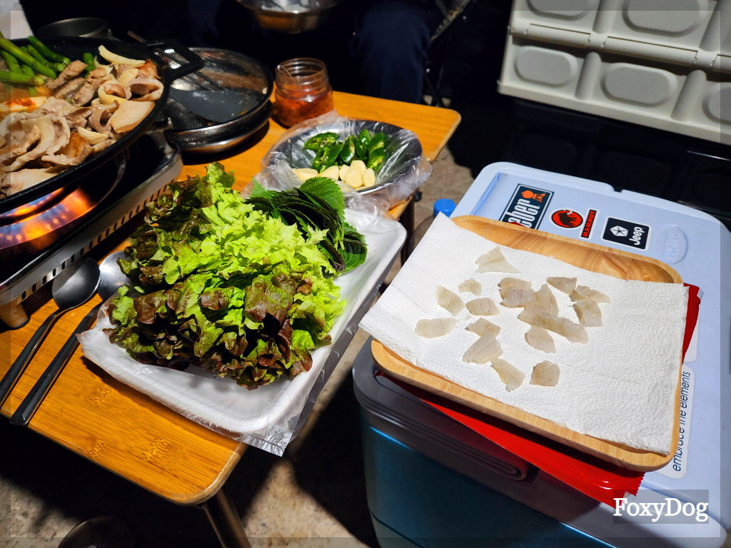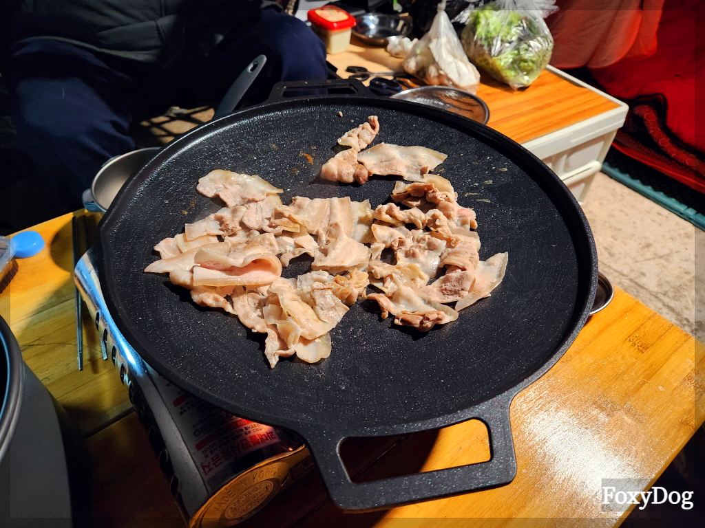 아버지와 오랜만에 야외에서 마시는 시원한 맥주 한잔을 하기 위해 술안주로 대패 삼겹살을 구워 먹었다. 이것을 위해 캠핑용 멀티 그리들팬도 구입하셨다고 한다. 자정을 넘긴 시간이라 많이는 먹지 않고 적당히 취기가 올라올 때쯤 잠들었다.