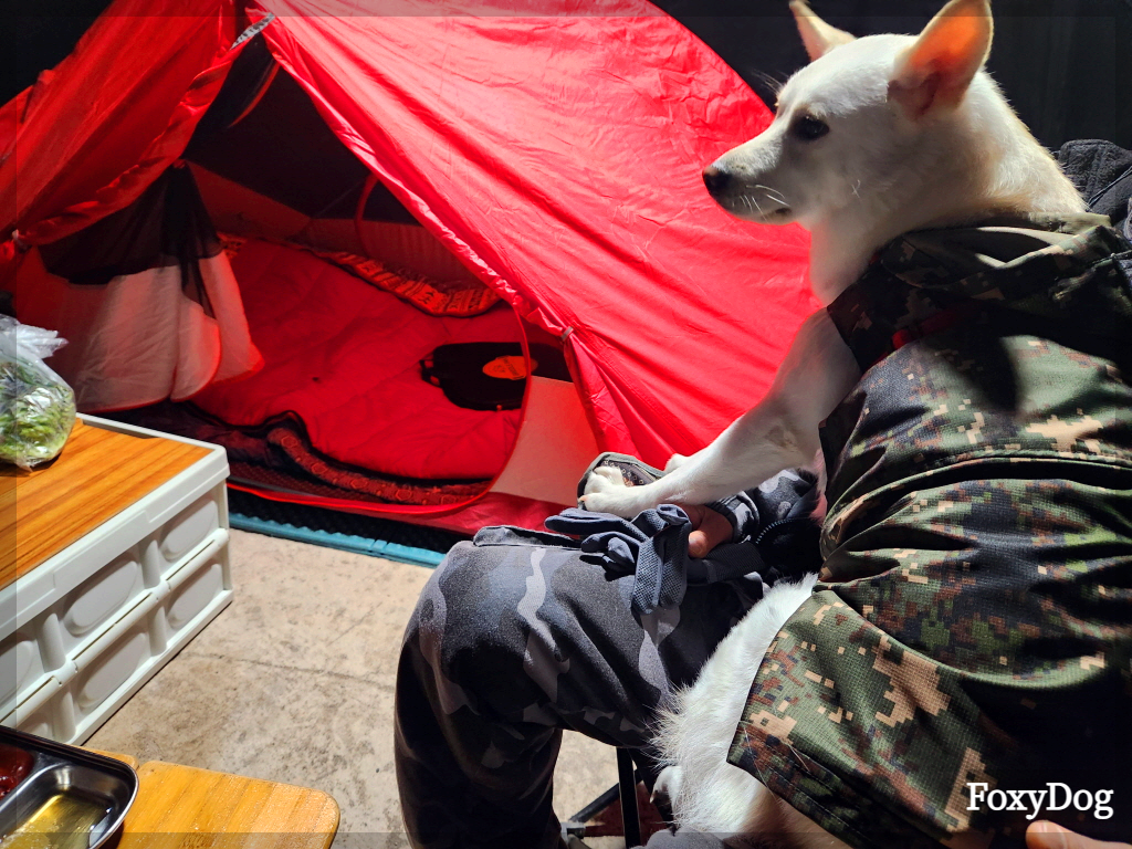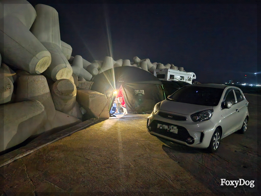 역시 아직 날씨가 추워서 그런지 밤에 노지 캠핑하시는 분은 별로 없는 것 같다. 덕분에 항상 치던 좋은 자리를 선점할 수 있었다. 바람이 많이 불긴 했지만 방파제가 어느 정도 막아주기 때문에 텐트 치기도 용이하다. 2박 3일 동안 우리 가족의 보금자리를 책임질 「루이지 쉘터(LUIGI SHELTER)」, 하도 많이 치다 보니 이제는 숙련된 조교 실력으로 1시간 내에 모든 준비를 마친다. 입구 왼쪽에는 아버지가 구입한 미니 랜턴이다. 유튜버들이 캠핑할 때 비싼 돈 주고 왜 거나 싶었는데 막상 보니 이해가 되었다. 입구에 은은한 불빛 하나 있을 뿐인데 먼가 모를 감성이 느껴진다.