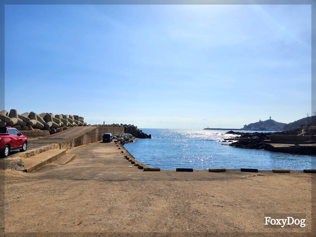 여기가 사진 3리 방파제로 들어오는 입구, 안으로 들어오면 생각보다 넓다. 그래서 텐트를 치기보다는 왼쪽의 캠핑카나 트레일러(카라반) 차박으로 더 인기가 많다. 한 중간에는 낮에 마을버스 터닝포인트로 되도록 비워두는 게 좋다. 또한 3월 중순 ~ 4월까지는 미역 철이라 해녀분께서 직접 채취한 돌미역을 말리기 위한 공간으로도 쓰이기 때문에 어민들에게 방해를 주지 않게 되도록 피하는 게 좋다. 이때의 동해 방파제 라인은 거의 다 미역을 건조한다고 보면 된다.