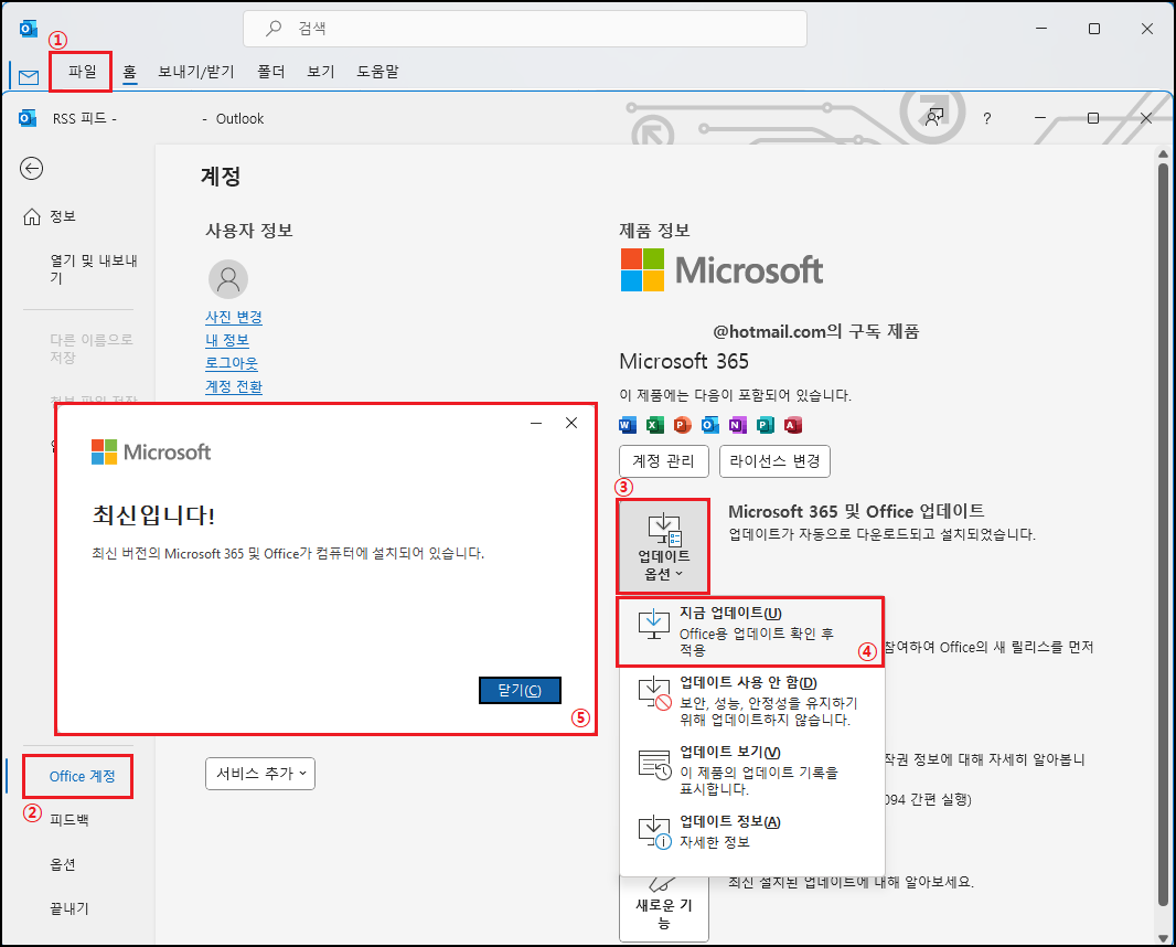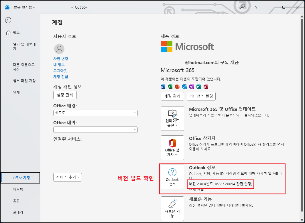 웹용 아웃룩을 이용하거나 웹메일 서비스만 이용하시는 분들은 전혀 신경 쓰지 않으셔도 되지만 Windows OS에 마이크로소프트 Outlook 프로그램을 설치하셔서 이용하시는 분들은 「최신 업데이트」 하시는 방법밖에 없습니다. 「파일 ▷ Office 계정 ▷ 업데이트 옵션 ▷ 지금 업데이트 ▷ 최신입니다! (확인)」