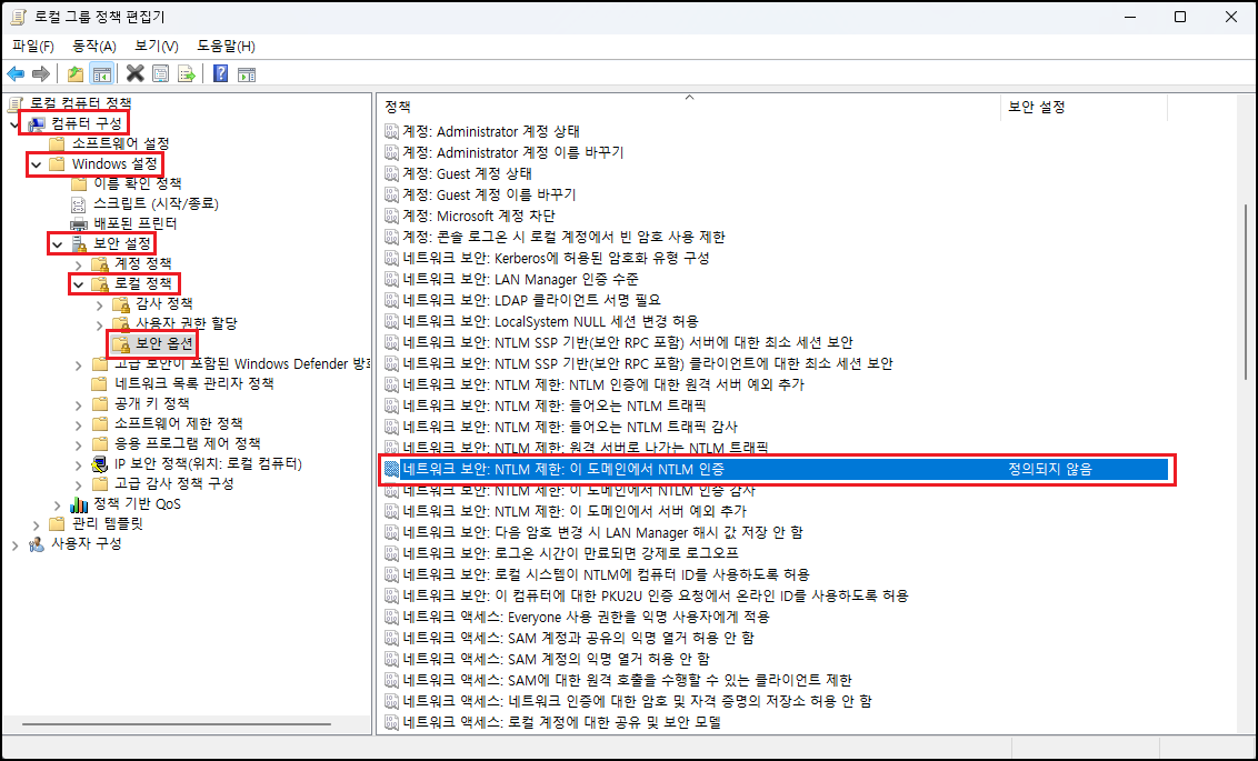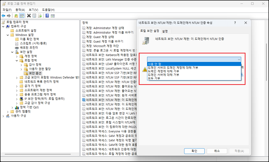 「로컬 그룹 정책 편집기 ▷ 컴퓨터 구성 ▷ Windows 설정 ▷ 보안 설정 ▷ 로컬 정책 ▷ 보안 옵션」에서 다양한 보안 옵션이 있는데 그중 「네트워크 보안: NTLM 제한: 이 도메인에서 NTLM 인증」 메뉴를 보시면 됩니다. 조건이 몇 개 있어서 정확한 원리를 이해해야 적용을 할 수 있을 것으로 보입니다. 꼭 적용을 해야 하시는 분들이 있다면 먼저 모두거부로 해보시고 사용 문제가 없다면 그대로 적용하고 문제가 있다면 원복(사용 안 함) 하시면 될 것 같습니다. ※ 적용(거부) 시에는 NTLM이 필요한 애플리케이션에 영향을 미칠 수 있습니다. 필자는 적용(모두거부) 해보았는데 특별히 안 되는 부분은 아직 없었습니다.