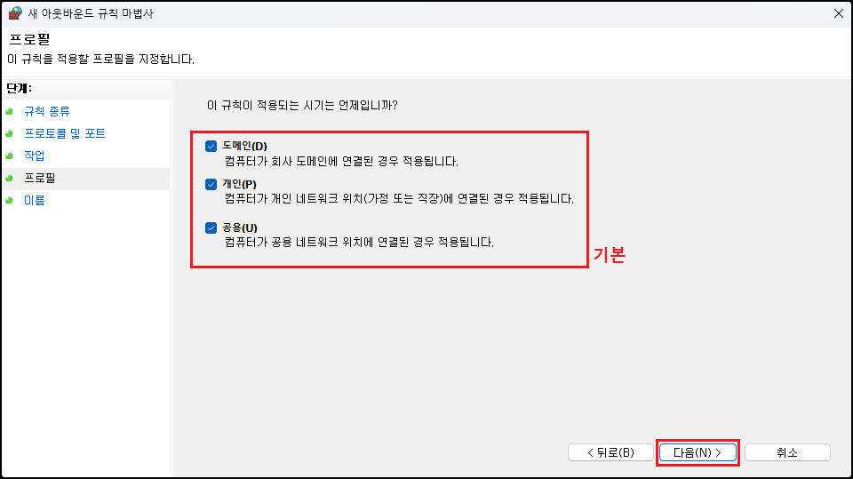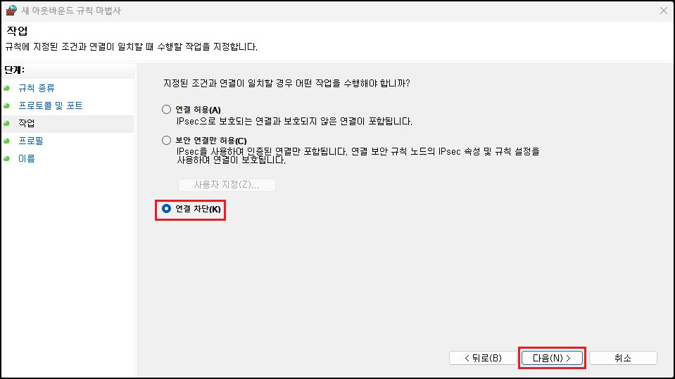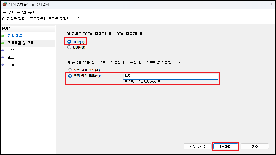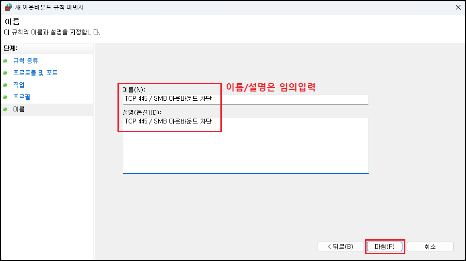 해당 방법은 개인 PC 로컬에 적용하는 방법이며, 별도의 앞단 방화벽이 있거나 VPN을 이용하는 경우 추가 적용해 주시면 됩니다. ※ 적용(차단) 시에는 파일 및 프린터 공유를 통한 서버 메시지 블록(SMB) 전송 및 수신이 막힐 수 있습니다. HTTPS(443)를 통한 WebDAV나 네트워크 프린터 인쇄 등에는 문제없습니다.