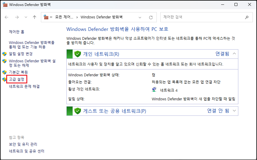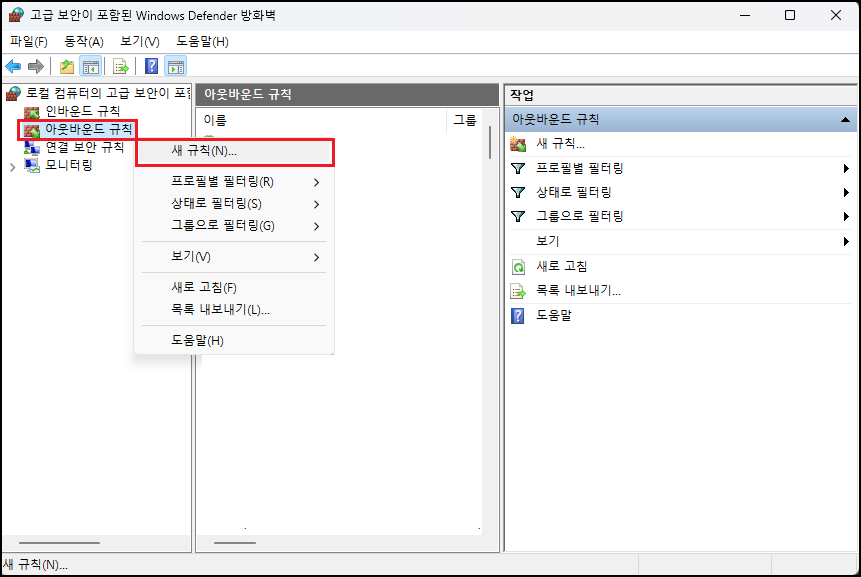 일반 Windows 사용자는 「고급 보안이 포함된 Windows Defender 방화벽」에서 아웃바운드 설정에 추가를 해주시면 됩니다. 똑같이 실행에서 「firewall.cpl」 입력하여 Windows Defender 방화벽 접근 후 「고급 설정」을 클릭하거나 Windows 10, 11일 경우는 검색에서 「고급 보안이 포함된 Windows Defender 방화벽」을 입력하여 접근하셔도 됩니다.