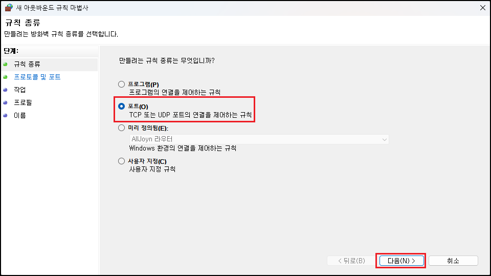 순서대로, 「아웃바운드 규칙 새 규칙 클릭 ▷ 규칙 종류 포트 선택 ▷ 규칙 TCP 선택 및 특정 원격 포트 445 입력 ▷ 연결 차단 선택 ▷ 이 규칙 적용 도메인, 개인, 공용 기본 선택 ▷ 이름, 설명 임의 입력 ▷ 아웃바운드 규칙 추가 확인」
