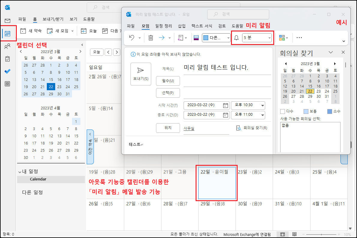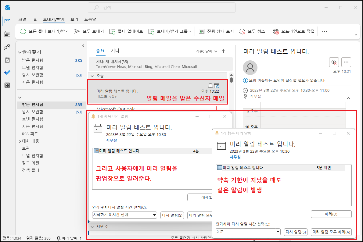 아웃룩 프로그램 「캘린더」에는 내 약속을 알리는 「미리 알림」 기능이 있습니다. 아래는 정상적인 미리 알림 기능을 사용했을 때 나오는 예시 화면입니다.