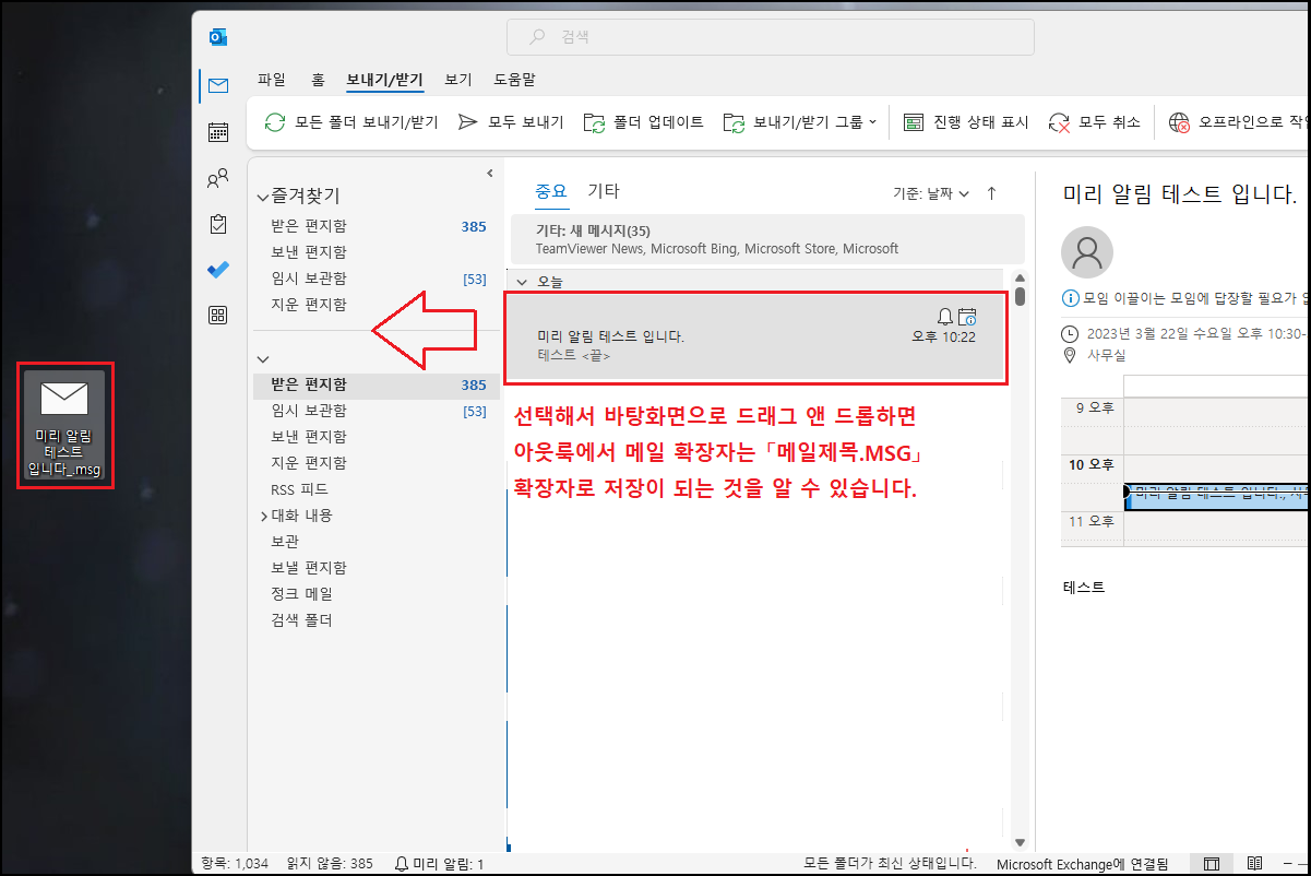 이거만 보시면 왜 발생하시는지 이해가 안되실 수 있는데, 수신받은 알람 메일을 선택해서 마우스로 바탕화면에 드래그 앤 드롭을 해보시면 아웃룩 메일 확장자는 「메일제목.MSG」 형태로 저장이 되는 것을 알 수 있습니다.