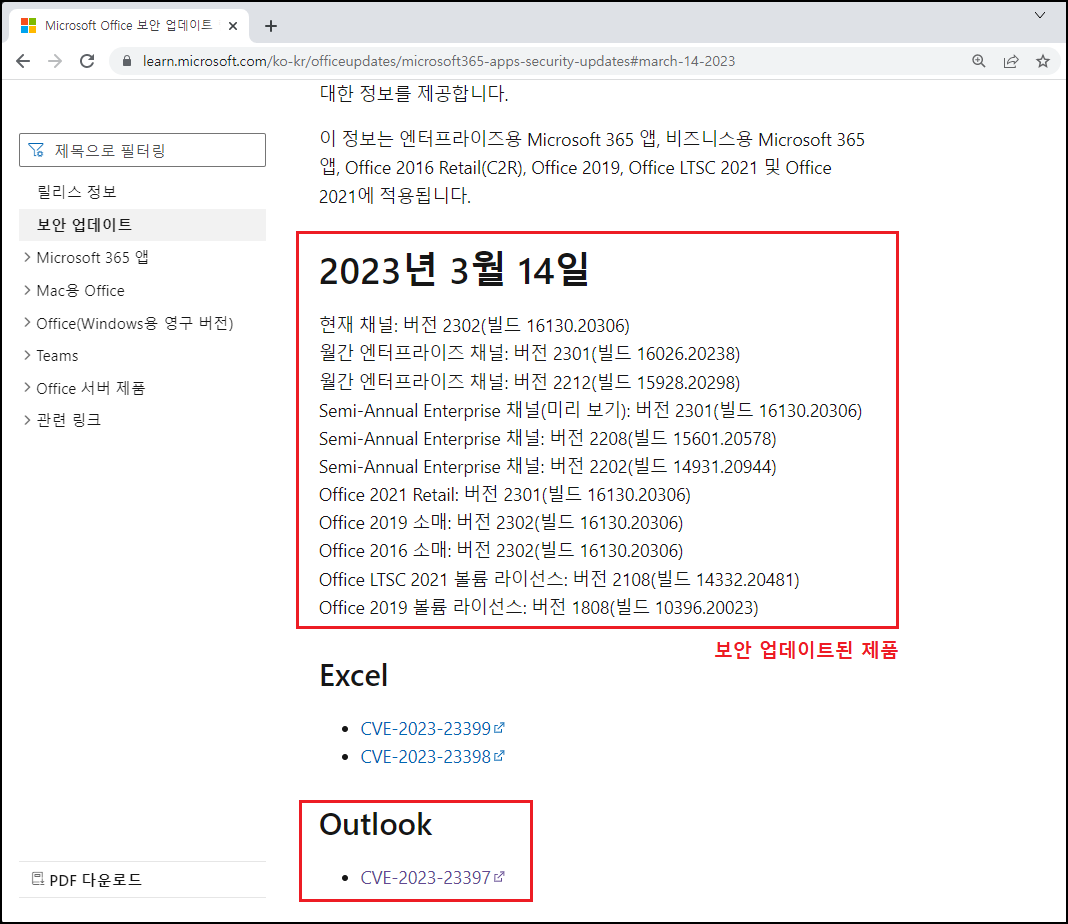 상단에 MS 공식 홈페이지(Office 보안 업데이트 릴리스) 접속해 보시면 「2023년 3월 14일」 기준으로 업데이트된 제품을 확인할 수 있습니다.