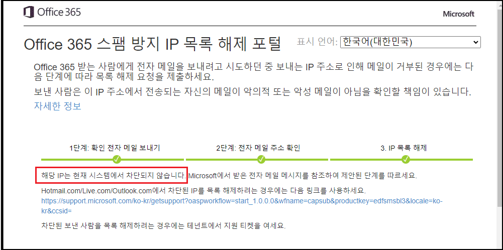 ◇ Office 365 스팸 방지 IP 목록 해제 포털 접근 : https://sender.office.com/