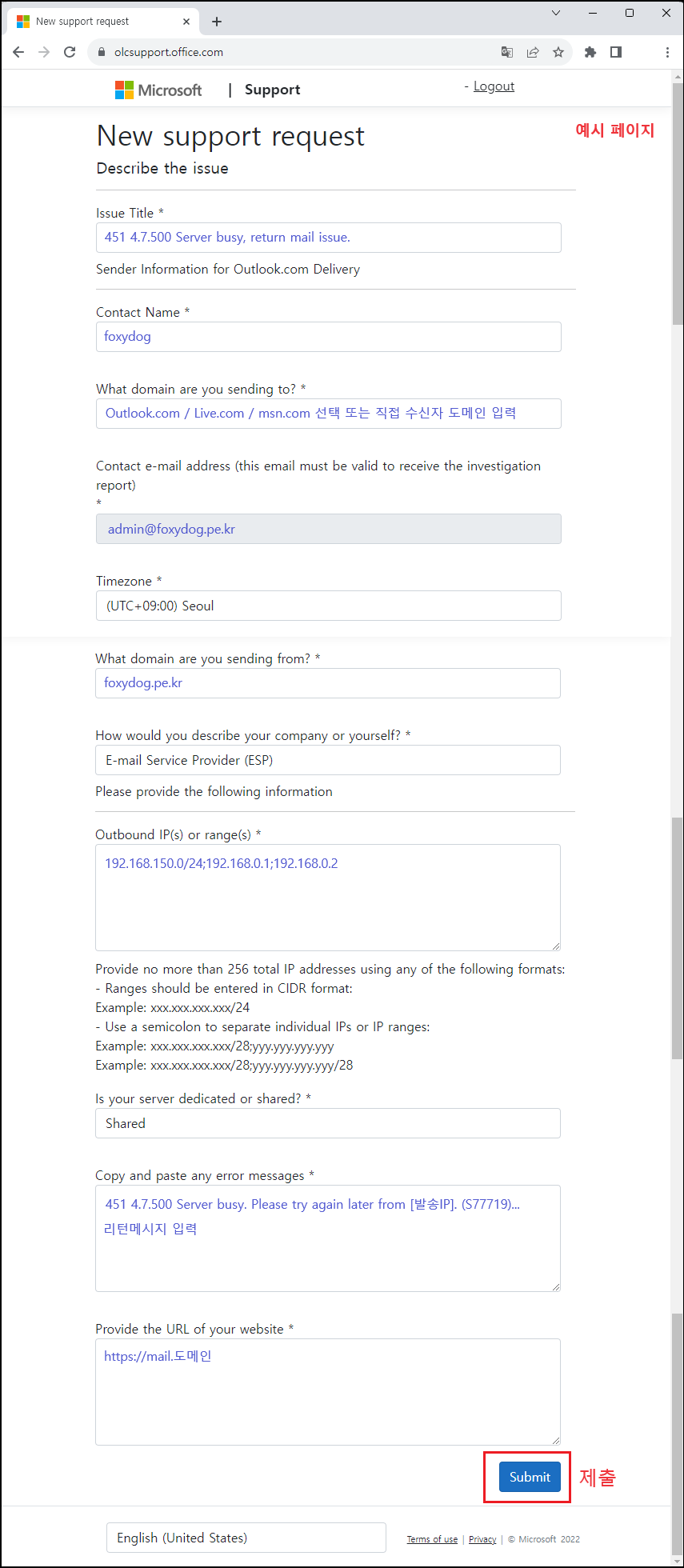 | ▷ 451 4.7.500 Server busy. Please try again later from [발송IP]. (S77719) [xxx.xxx.prod.outlook.com 또는 xxx.xxx.protection.outlook.com] 의 형태 |