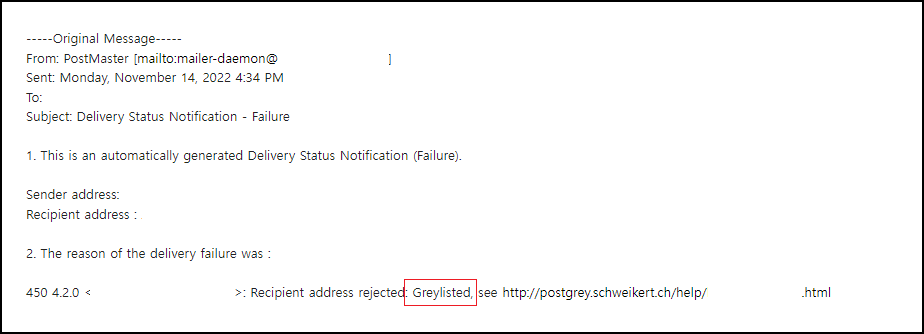 해당 리턴메일은 길게 얘기할 게 없습니다. 약간의 여유를 가지고 「Greylisted (for 300 seconds)」 대기 시간만큼 기다렸다가 재발송을 하시면 대부분 문제없이 수신자에게 메일을 발송할 수 있습니다. 짧게는 1분에서 길게는 60분 정도까지 설정하는 관리자가 있으며 그 이상은 메일로서의 즉각적인 수발신 기능에 방해가 되기 때문에 평균적으로 5분이 적당하다고 합니다.