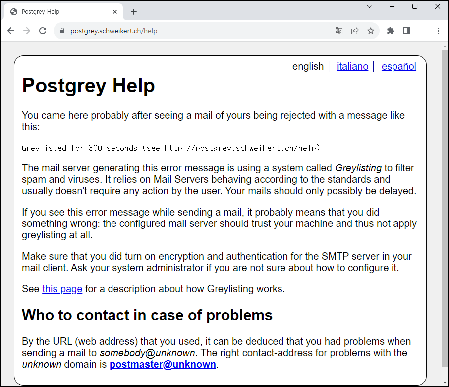 간혹 SEE 옆에 URL : http://postgrey.schweikert.ch/help 주소를 클릭하여 사이트를 확인해 보면 포스트그레이 「Postgrey」 도움말이 나오는데 스팸 및 바이러스를 필터링하기 위해 그레이리스팅이라는 시스템을 사용하고 있다는 안내를 하고 있습니다.