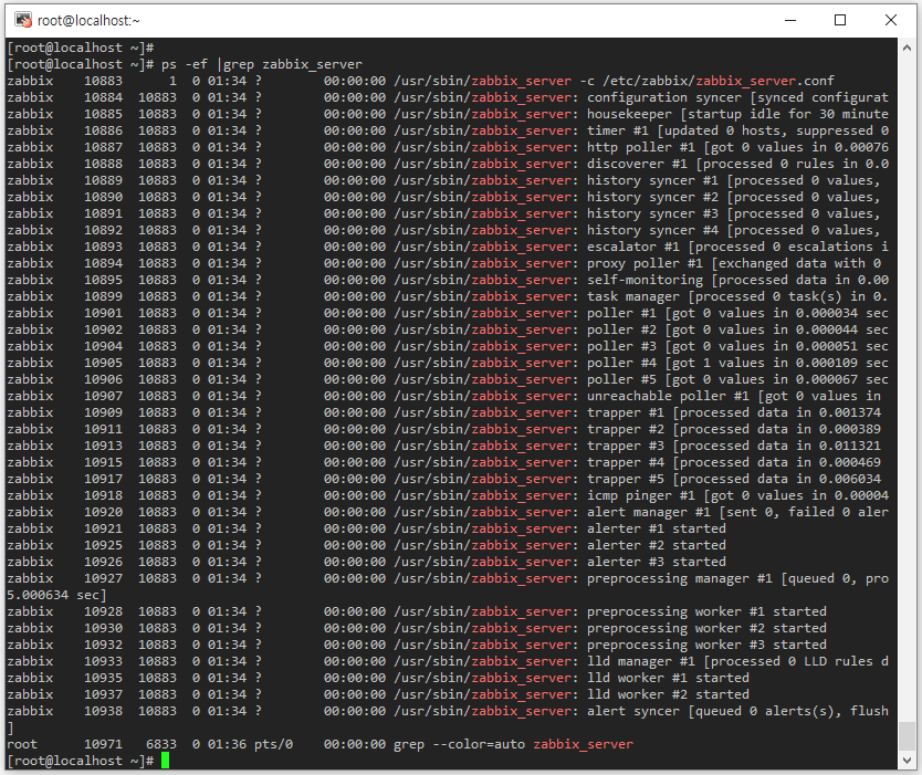 zabbix 10162 1 0 01:06 ? 00:00:00 /usr/sbin/zabbix_server -c /etc/zabbix/zabbix_server.conf