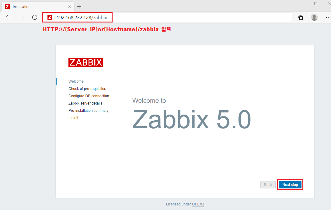 9. Zabbix Web 설치 페이지 접속 [http://서버IP 또는 호스트네임/zabbix]