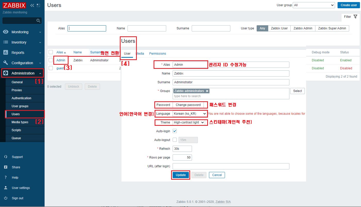 10. 웹 관리자 기본 설정 [Administration ▷ Users ▷ Admin 계정 클릭]
