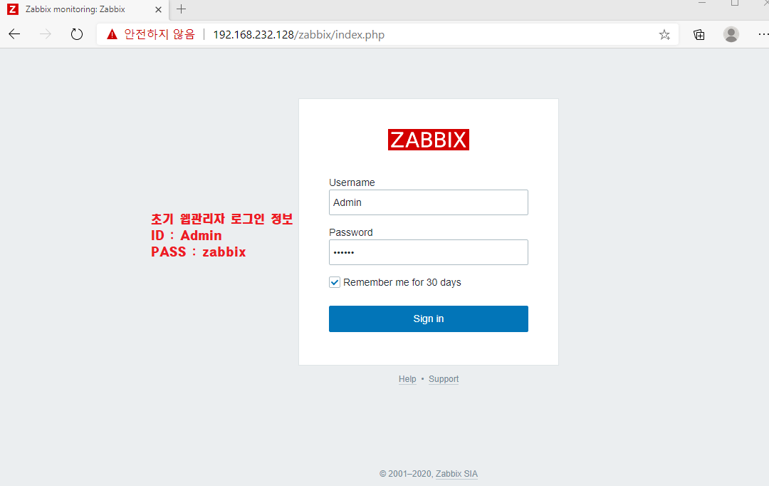 9-7 설치 후 처음 웹 관리자 로그인 페이지 접속 정보는 [ ID : Admin / PASS : zabbix ]입니다. [대소문자 주의]