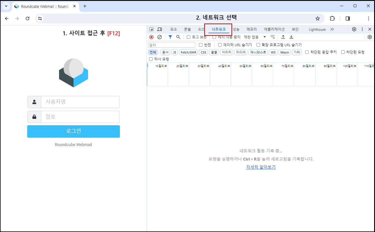 어떤 브라우저든 사이트 접근 후에 「F12」을 누르면 대부분 개발자 툴을 지원합니다. 그다음 네트워크「Network」 메뉴를 선택합니다. 네트워크 활동 기록 중 상태가 보이면 사이트에 요청을 하거나 「Ctrl+R」을 눌러 새로고침을 합니다.
