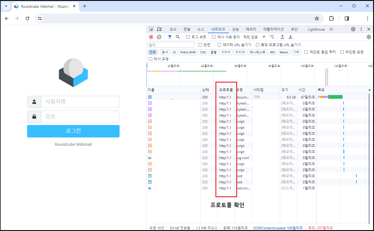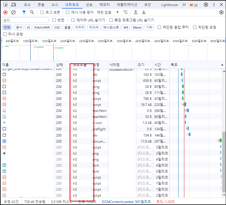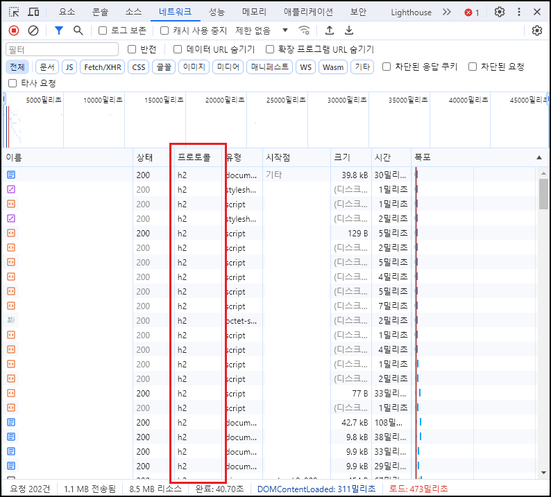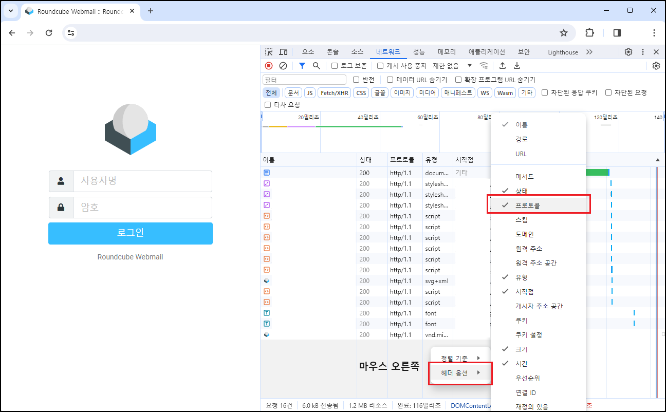 요청 값이 나오면 프로토콜「Protocol」 라인을 확인하면 HTTP 버전을 확인할 수 있습니다. 만약 해당 라인이 보이지 않는다면 기본값은 선택되어 있지 않아 빈 공간 마우스 오른쪽 클릭 후 「헤더 옵션」에서 프로토콜「Protocol」을 선택하면 됩니다.