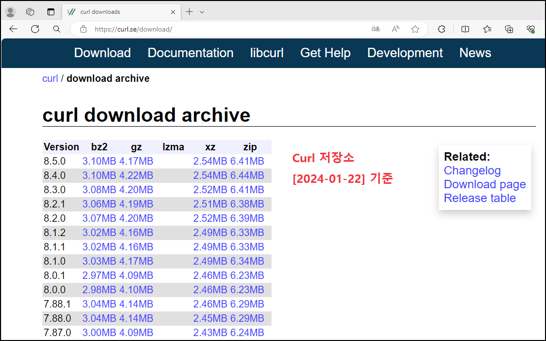 Curl 공식 사이트 저장소 : https://curl.se/download/