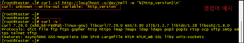 처음에는 명령어 Unknown 발생해서 확인해 보니 「-w, --write-out <format>」 해당 옵션이 Curl 버전이 몇 이상에서 생긴 거라 버전이 낮아 사용을 못한 부분입니다.