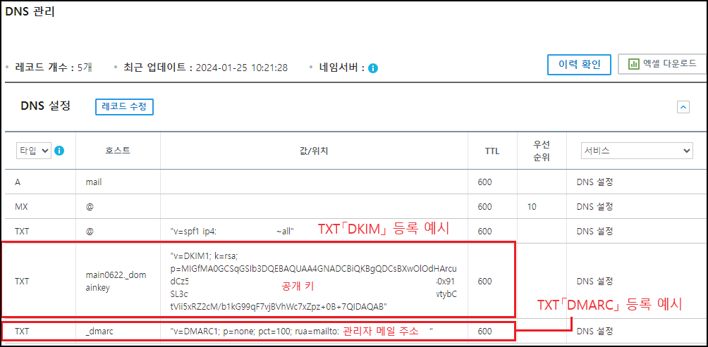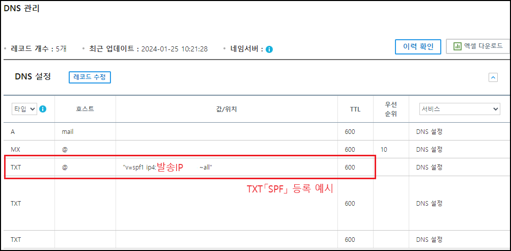 SPF는 레코드 「TXT」 타입으로 등록하며 「v=spf1 ip4:xxx.xxx.xxx.xxx ~all」 또는 발송 서버가 여러 대가 있다면 인클루드 「v=spf1 include:foxyspf.testmail.com ~all」의 형태로 들어갑니다. 단독형 메일 서버일 경우는 단일 IP로, 호스팅 또는 클라우드 서비스 이용 시에는 안내에 따라 등록하시면 됩니다.