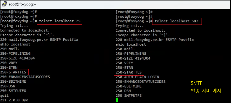 발송 포트 테스트로 「250-STARTTLS」 응답 확인