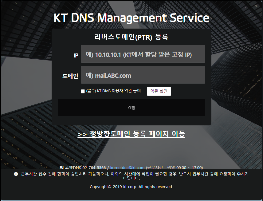PTR등록은 네임서버를 제공하는 업체가 아닌 그 해당 IP를 관리하는 ISP인터넷공급「KT, LG U+, SKT」등의 업체에 등록을 해야 합니다. 아래는 KT에서 제공하는 리버스 도메인 등록 서비스 예시 페이지입니다.