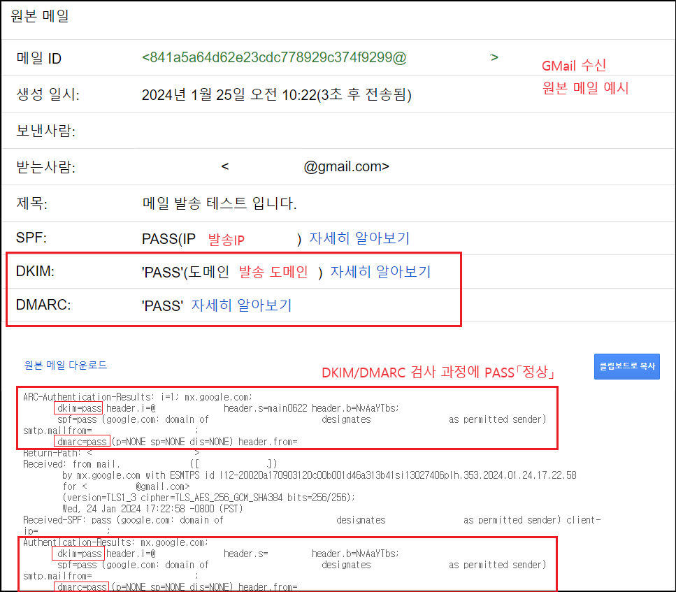 적용 후 GMail에서 수신된 원본 헤더를 확인해보면 DKIM+DMARC가 PASS가 떨어진다면 정상적으로 정책이 적용되어 있다는 의미입니다.