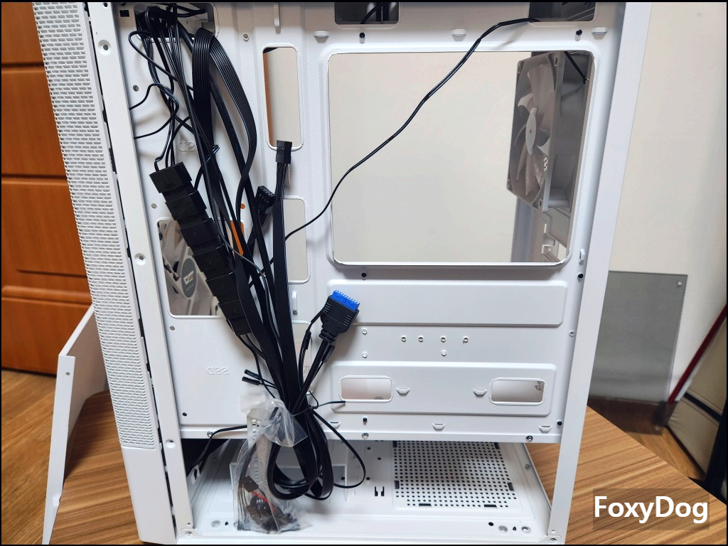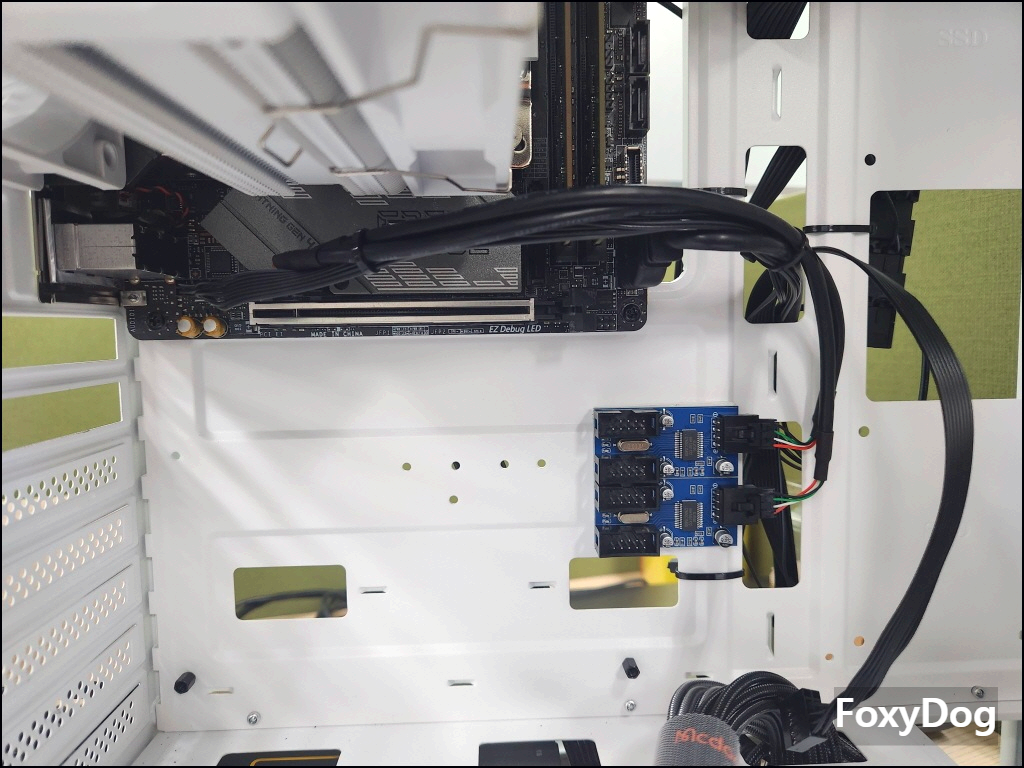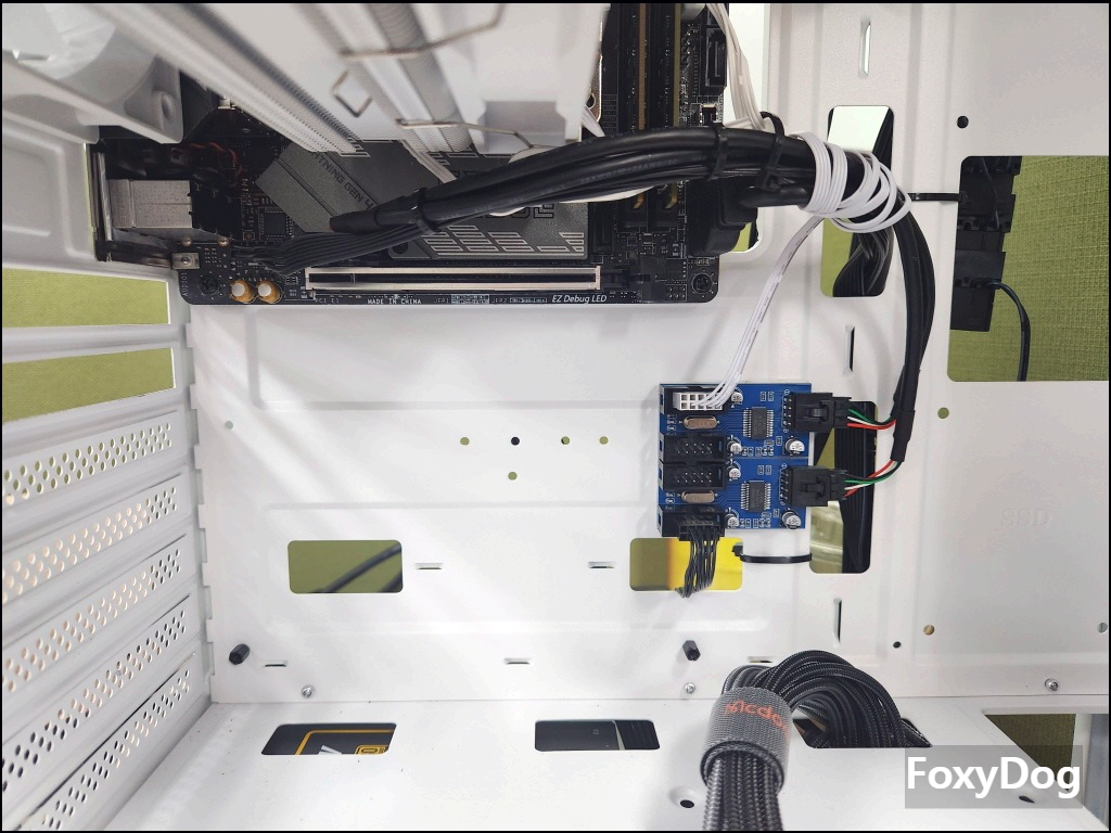 단점이라면 뒷면 공간이 협소해서 선정리 난이도가 높습니다. 또한 케이스 팬 6개를 한 번에 돌려야 해서 IDE(Molex) 케이블이 도배가 되어 있습니다. 저런 형태는 접지가 고정이 잘 안 돼서 최종 조립할 때 위아래로 한번 꾹 눌러줘야 합니다.