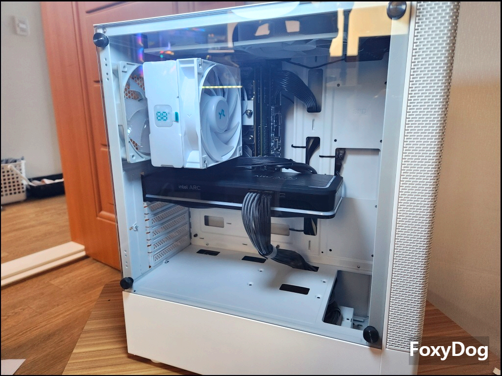 1차 조립 완성 모습입니다. USB 단자가 부족해서 일단 쿨러만 연결하였습니다. Mini-ITX 메인보드라 공간이 많이 남아서 허전한 느낌이 조금 납니다. 그래도 모난 부분 없이 깔끔하게 조립되었습니다. RGB도 있어서 나름 밸런스는 있어 보입니다.