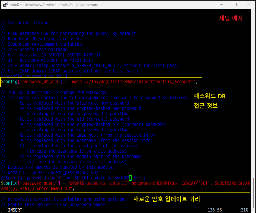 136 //$config['password_query'] = 'SELECT update_passwd(%P, %u)'; [※ 주석 처리 후, 아래 예시 참고]