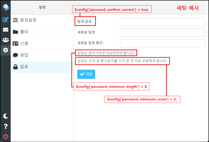 ◇ 새로운 암호를 설정하기 위해서 현재의 암호를 확인 합니다. 대부분의 메일 솔루션은 보안을 위해 사용 「true = 사용」 「false = 사용안함, 또는 //주석 처리」 |