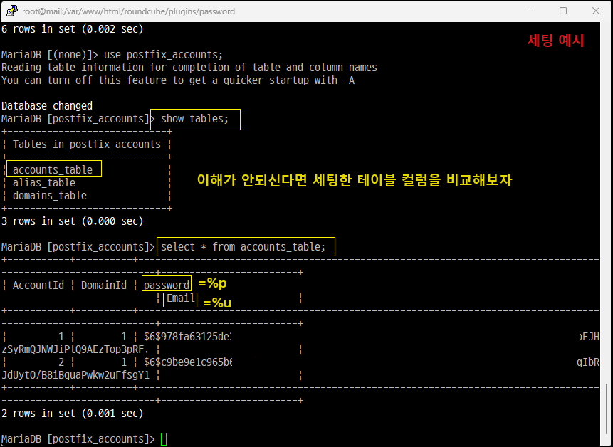 ※ 패스워드 칼럼은 관리자마다 다르게 설정할 수 있습니다. ENCRYPT 「단방향 hash 알고리즘 방식으로 SHA-2 중 가장 강력한 SHA-512 해시 함수」입니다. 평문에서 암호화하므로 「 %p 」 소문자로 사용해야 합니다. 메일서비스 특성상 패스워드는 한번 암호화되면 복고화 불가능한 방식으로 하는 게 좋습니다. 양쪽 쌍 따옴표 「 " " 」로 하나의 쿼리로 인식하므로 문법 주의합니다. CONCAT('「$6$」' 부분은 임의값으로 하면 됩니다. 추출된 16자를 (option) 해당 값과 결합하여 랜덤으로 패스워드를 만드는 부분, 단 처음 관리자가 패스워드를 할당해 주셨을 때와 같은 문자열로 세팅할 것