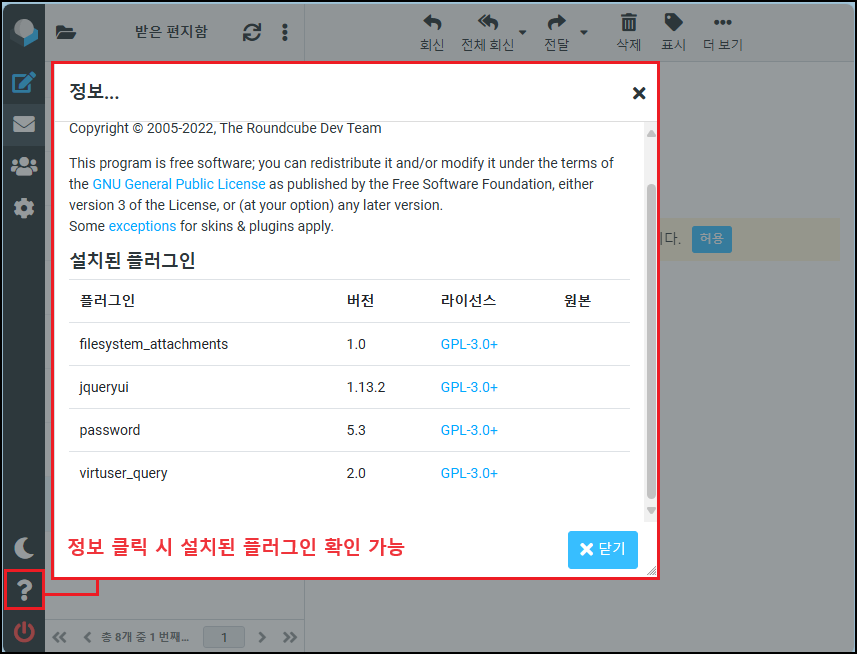 「~/roundcube/plugins」 경로에 이미 현재 버전에서 안정적으로 사용할 수 있는 플러그인들이 설치가 되어 있습니다. 그 외 플러그인 설치를 하실 경우는 아래 공식 홈페이지 Plugins 설치 방법 참고