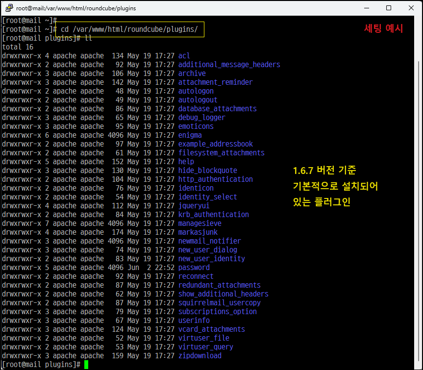 플러그인「Plugin」은 프로그램 또는 소프트웨어등 기존에 없는 기능을 더욱 확장하고 사용자 편의성을 높이기 위한 환경을 제공합니다. 지금 티스토리 에디터에서 글을 작성할 때 더 보기에 있는 「코드블럭」이나 「이전 발행 글 넣기」도 플러그인에 해당됩니다. 오픈소스인 RoundCube에도 사용자 편의성을 위한 웹메일 플러그인을 다양하게 제공하고 있습니다. 그중 사용자가 직접 패스워드를 변경할 수 있도록 만들어주는 「Password」 플러그인이 있습니다. 그냥 적용한다고 해서 바로 되는 게 아닌 사용자 구성에 맞게 커스텀이 필요하므로 이에 대해서 알아보도록 하겠습니다. 필자가 구축한 방식으로 진행하셨다면 기본 설치된 플러그인은 「Filesystem_attachments」, 「jqueryui」, 「virtuser_query」 3개가 기본으로 적용되어 있습니다.