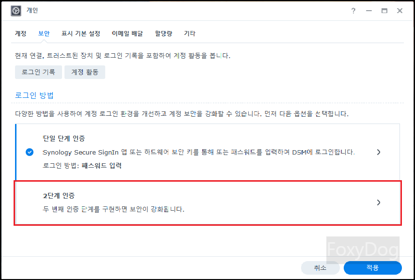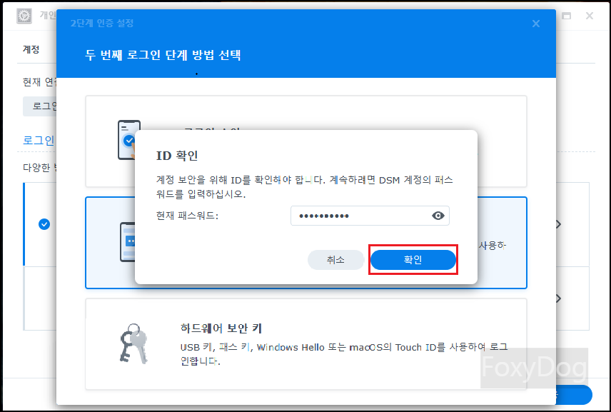 DSM에서 오른쪽 상단 「사용자 클릭 → 개인 → 보안 (로그인 방법)」에서 언제든지 변경이 가능합니다.