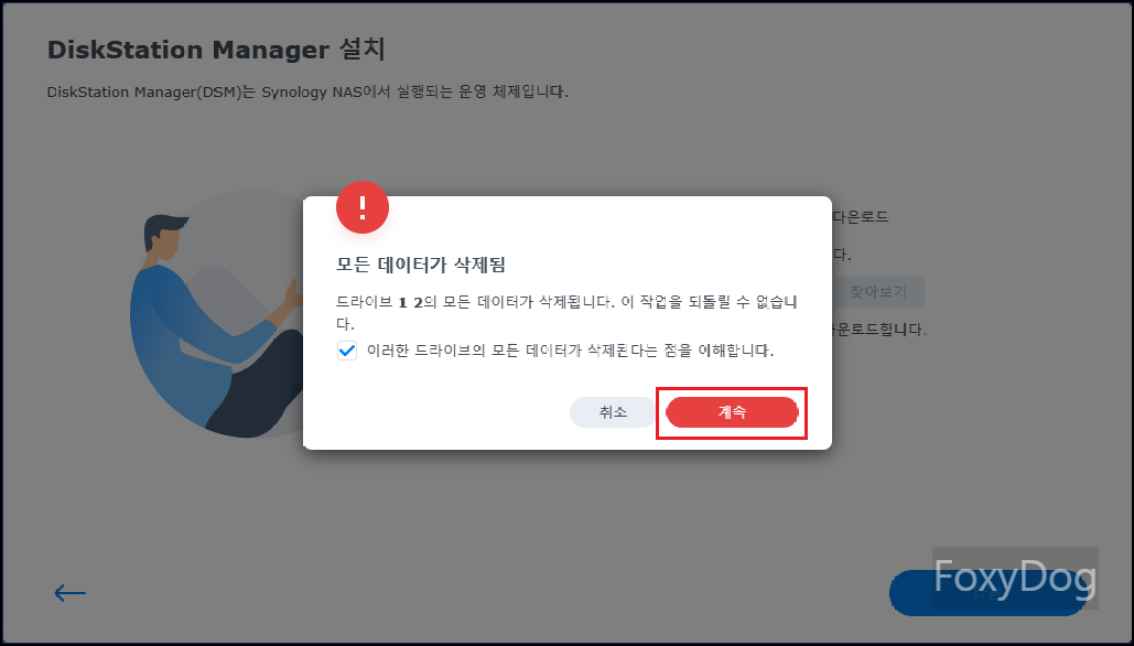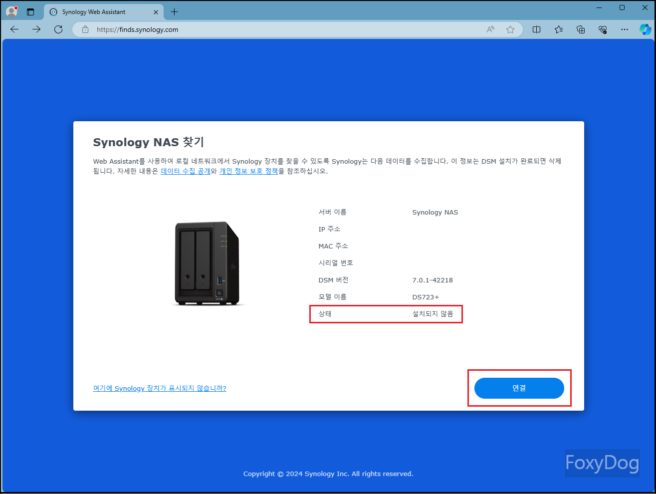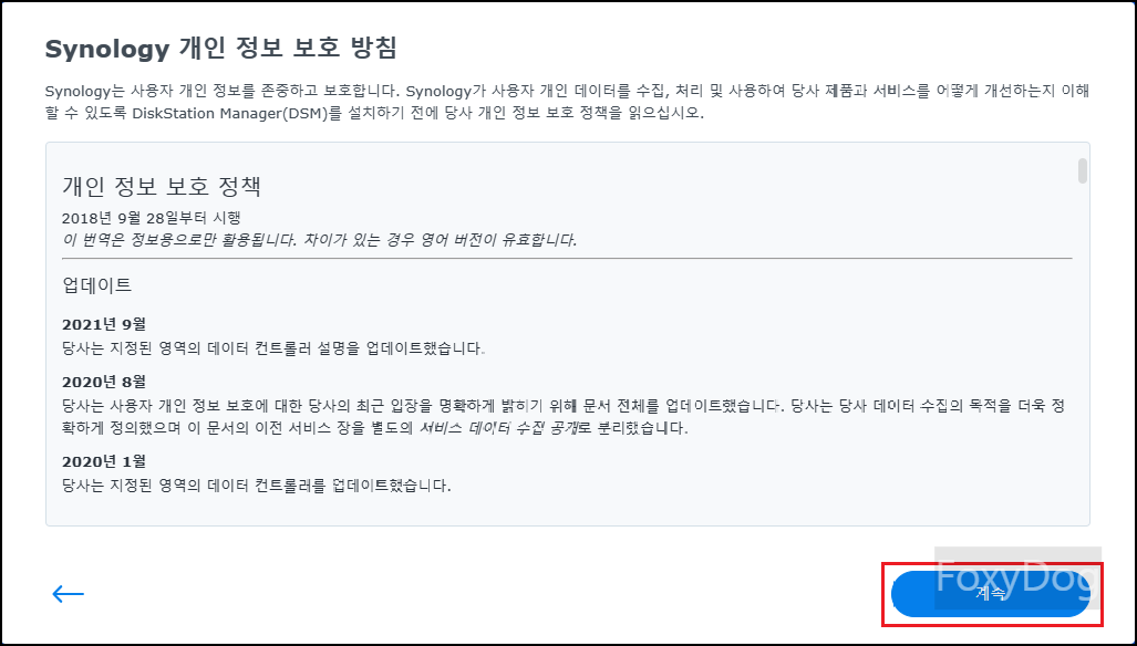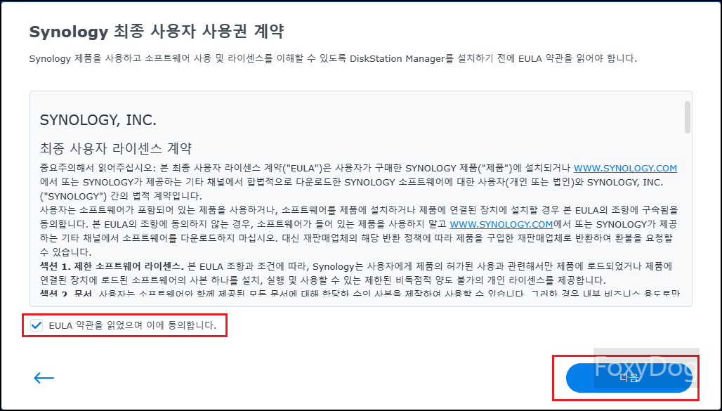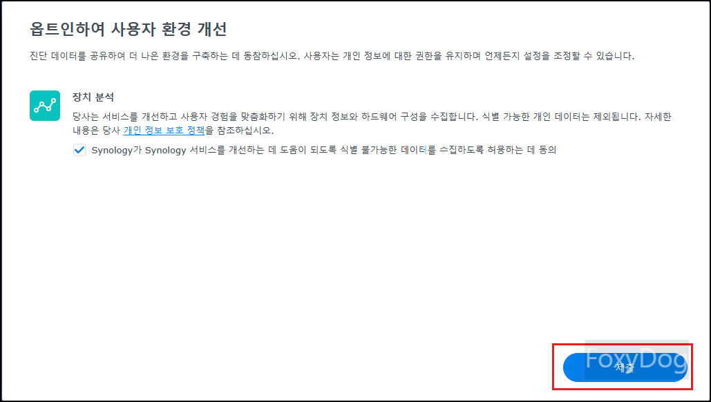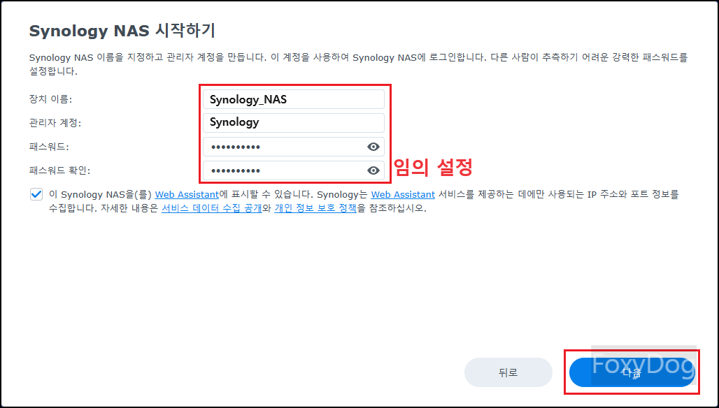 ※ 메시지 참고 : 「Web Assistant를 사용하여 로컬 네트워크에서 Synology 장치를 찾을 수 있도록 Synology는 다음 데이터를 수집합니다. 이 정보는 DSM 설치가 완료되면 삭제됩니다.」 하니 혹시나 개인 정보에 예민하신 분들은 걱정하지 않으셔도 됩니다.