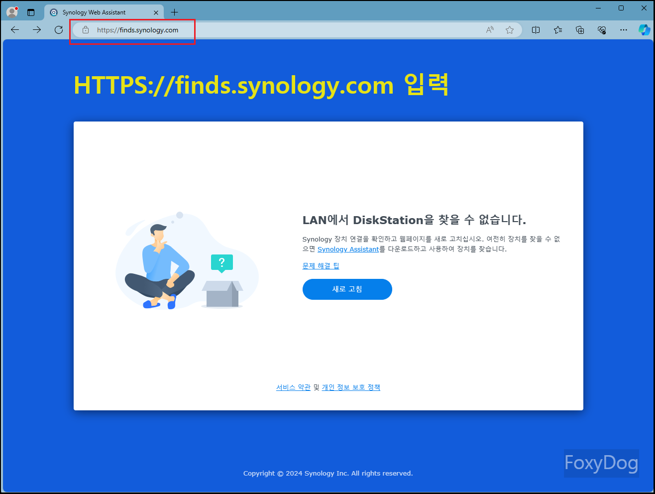 인터넷이 되는 환경에서 개인 PC 클라이언트와 Synology NAS 하드웨어가 같은 네트워크(공유기)상에 있다면 브라우저 주소에 「URL : HTTPS://finds.synology.com」 입력 시 자동으로 장치를 검색합니다.
