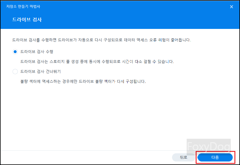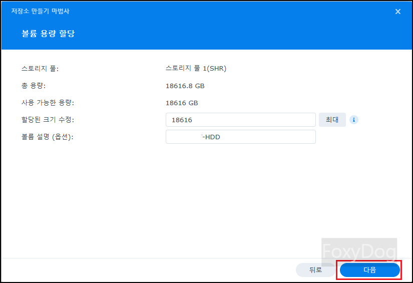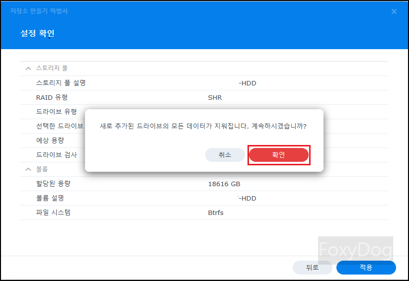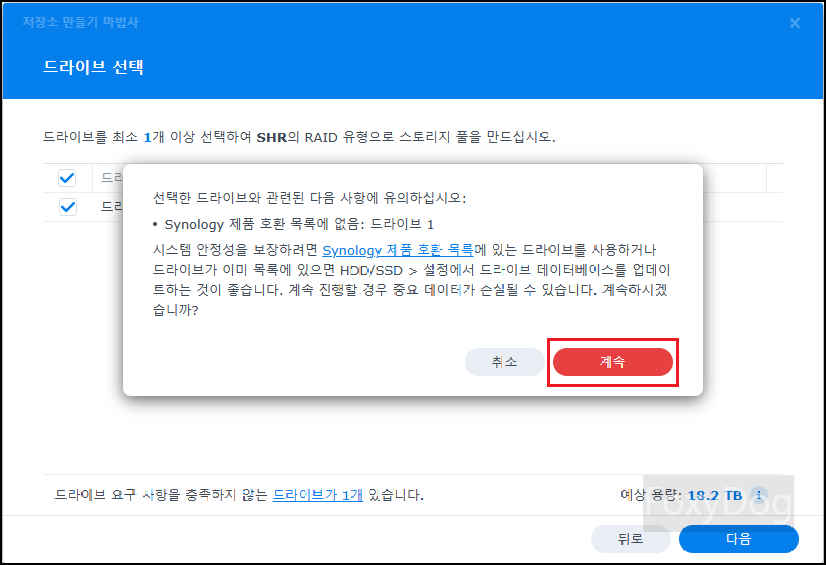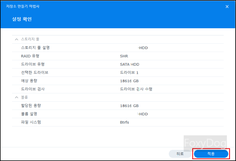필자는 HDD 단일 스토리지로 기본적인 RAID 「SHR」 유형으로 선택합니다. 혹시나 여유가 생겨 동일한 HDD를 하나 더 구매하여 장착하면 「RAID 1 (MIRROR)」로 작동하여 동일한 데이터 중복을 보장할 수 있습니다. 입문자의 경우 가장 쉽게 레이드를 구성할 수 있습니다.