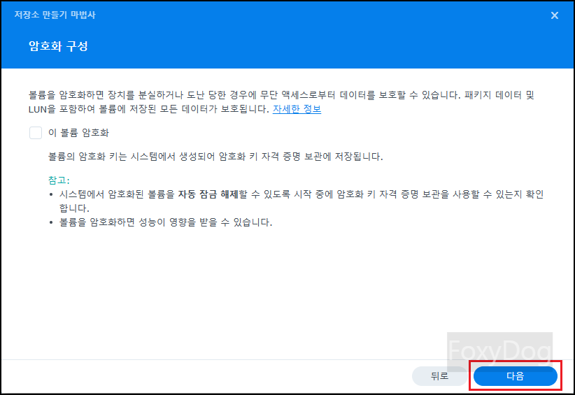 잘 모르실 경우 (권장) 기본 설정으로 넘어갑니다. 볼륨 암호화는 체크하지 않습니다. 로컬 네트워크에서 개인 사용자 혼자 사용하는데 굳이 암호화는 필요 없습니다. 보안을 신경 쓰는 기업이나 중요한 데이터 유출을 막기 위해 체크하여 사용할 수도 있습니다. 단 암호화 하고 데이터가 커질 수도록 성능에 영향을 받을 수 있습니다.