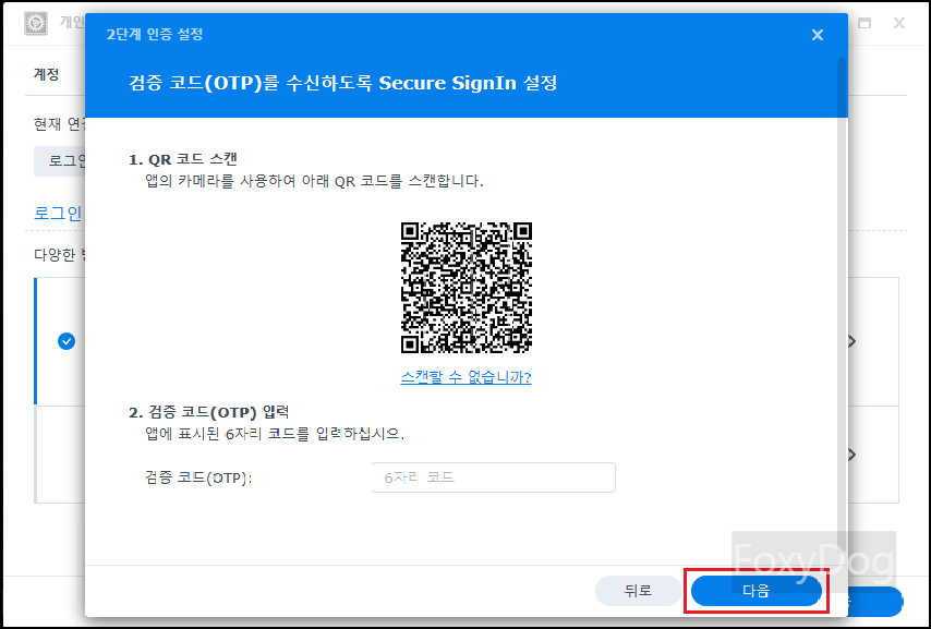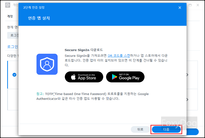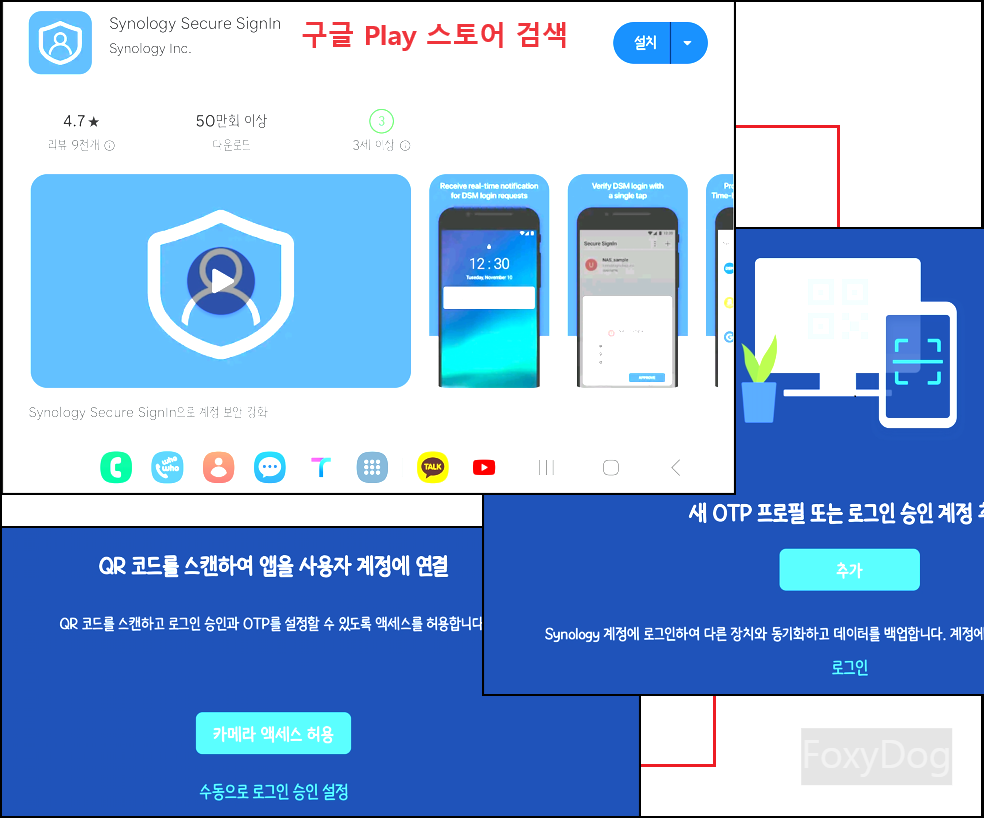 아래는 안드로이드 모바일 구글 Play 스토어 검색에서 「Synology Secure SignIn」 앱을 검색하여 설치 후 QR 코드를 스캔하거나 수동으로 OTP를 등록합니다. 정상적으로 등록이 되면 2. 검증 코드 6자리를 추가로 입력한 후에 다음으로 넘어갑니다. ※ 참고 내용 : TOTP(Time-based One-Time Password) 프로토콜을 지원하는 구글 OTP 「Authenticator」와 같은 타사 인증 앱도 사용할 수 있습니다.
