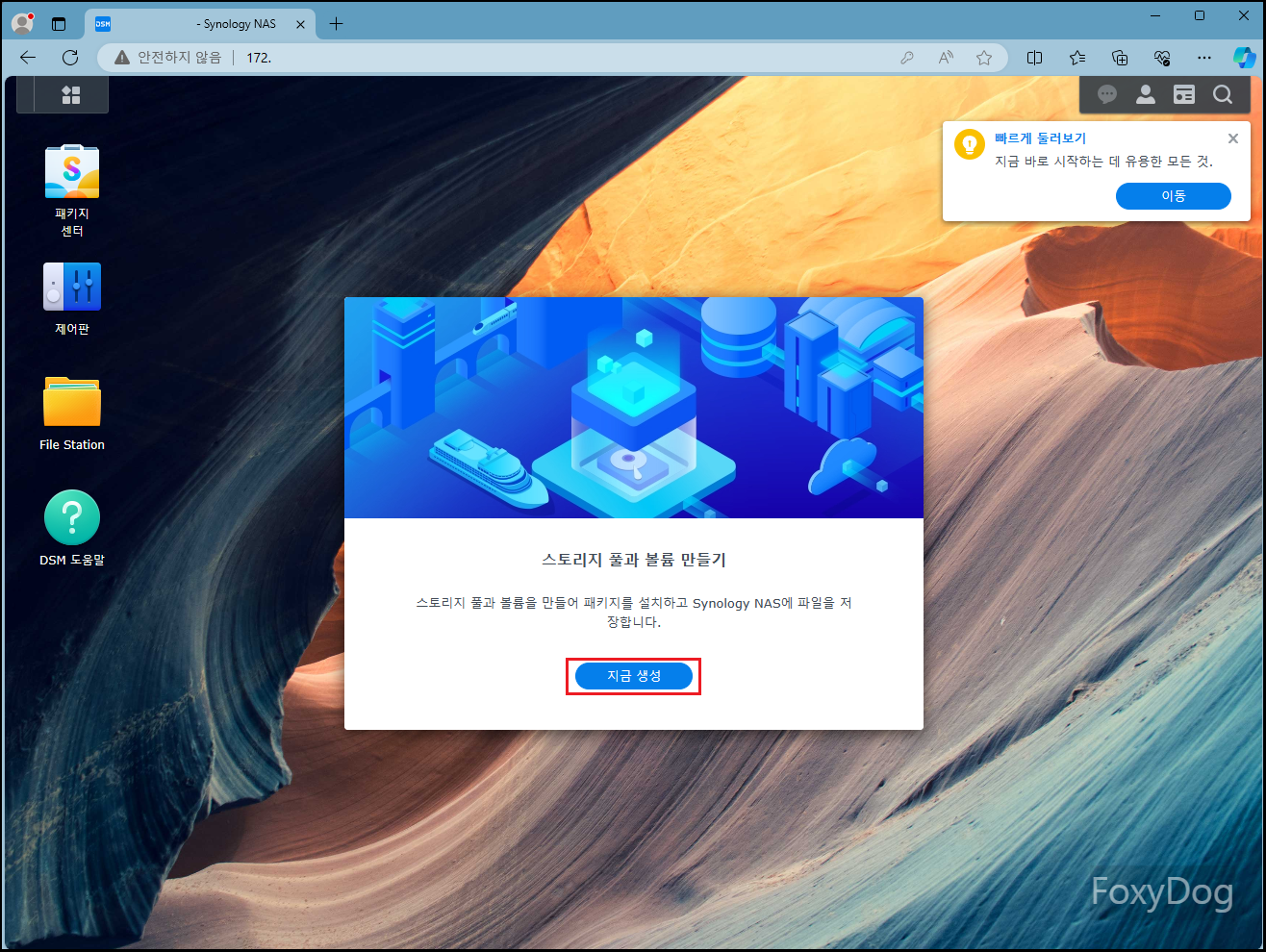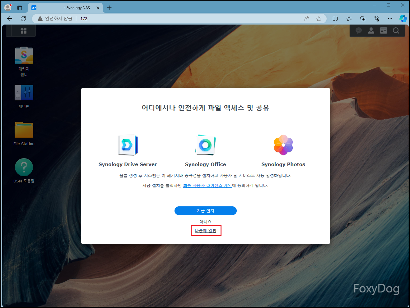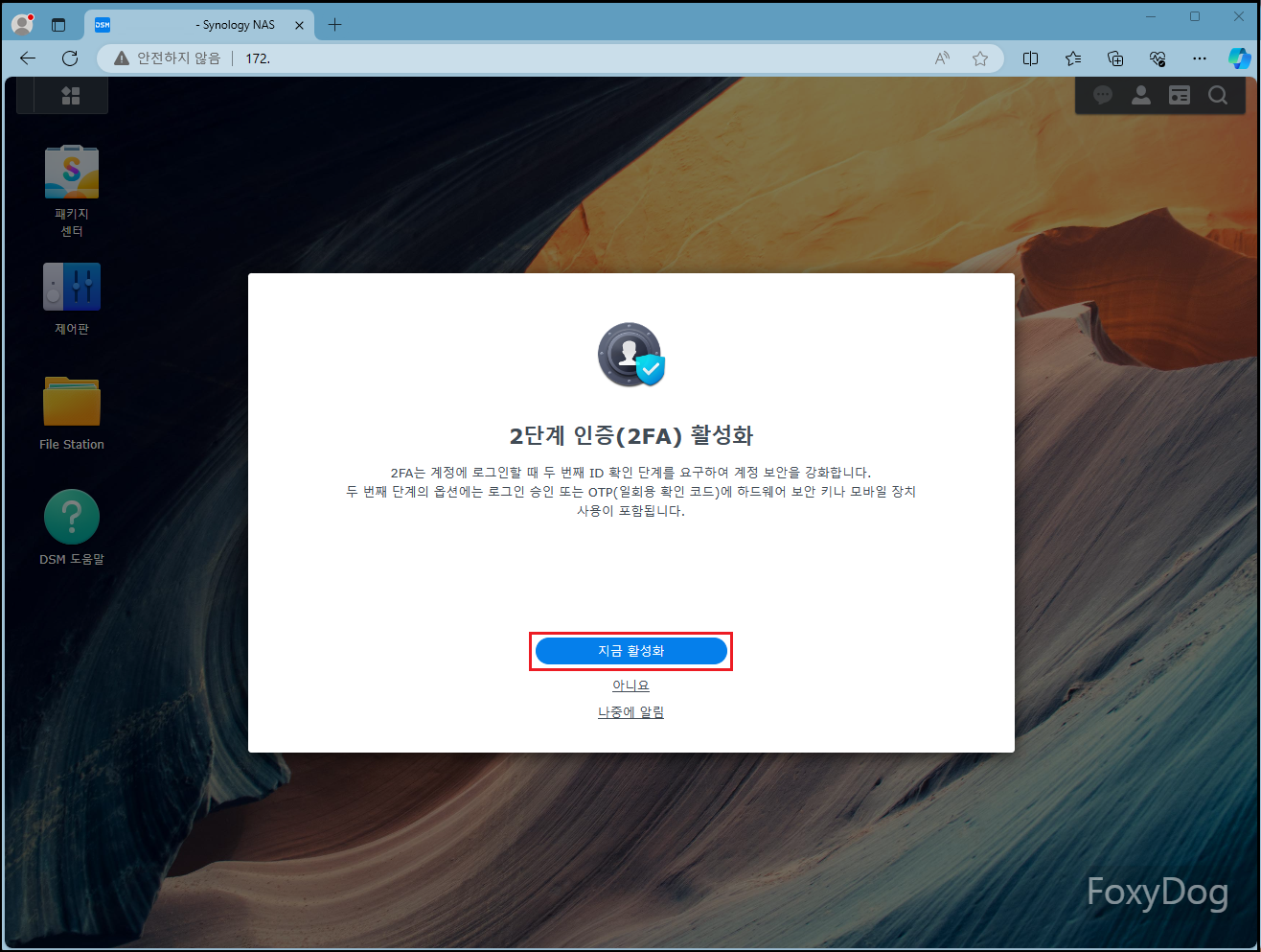 처음 설치 또는 접근하면 가입 및 패키지 센터 이용을 위해 해당 화면이 계속 나옵니다. 당장 급한 부분은 아니므로 일단「나중에 알림」 클릭하여 넘어갑니다. 그다음 보안을 위해 「2차 인증」 활성화 메뉴가 나옵니다. 요즘 같은 인터넷 무법지대에는 필수겠죠? 바로 지금 활성화를 클릭합니다.