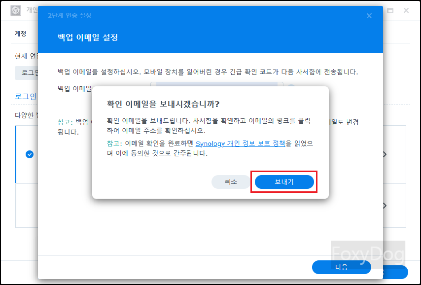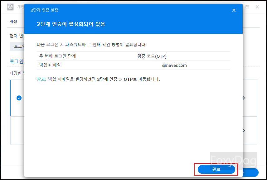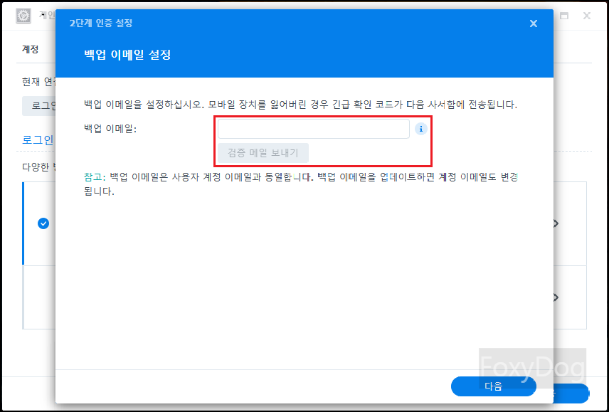 OTP 인증이 되었다면 혹시나 모바일 장치를 잃어버렸을 때를 대비하여 긴급 확인 코드를 받기 위해 「백업 이메일 설정」을 진행합니다.